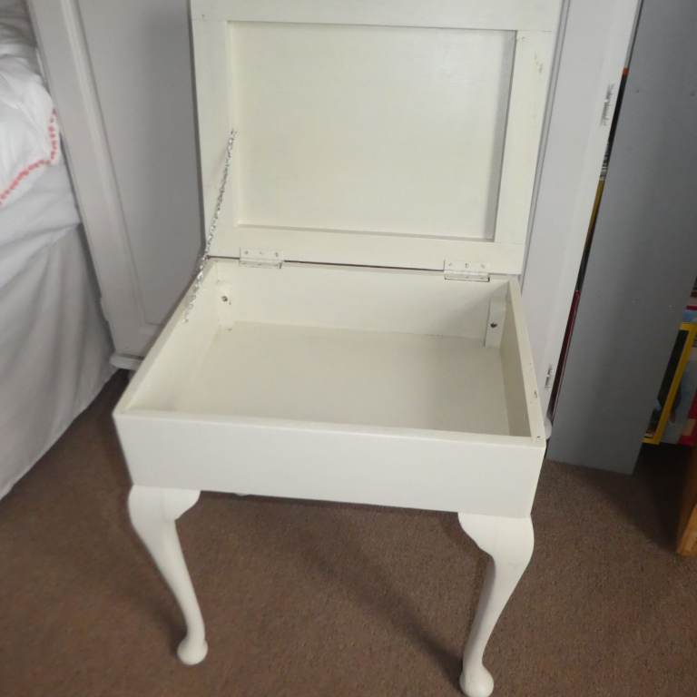 An antique stool, reupholstered and painted in Farrow and Ball shaded white, lid opens for storage, 18 inches x 14and half inches x 20 height, for sale within horncastle area.