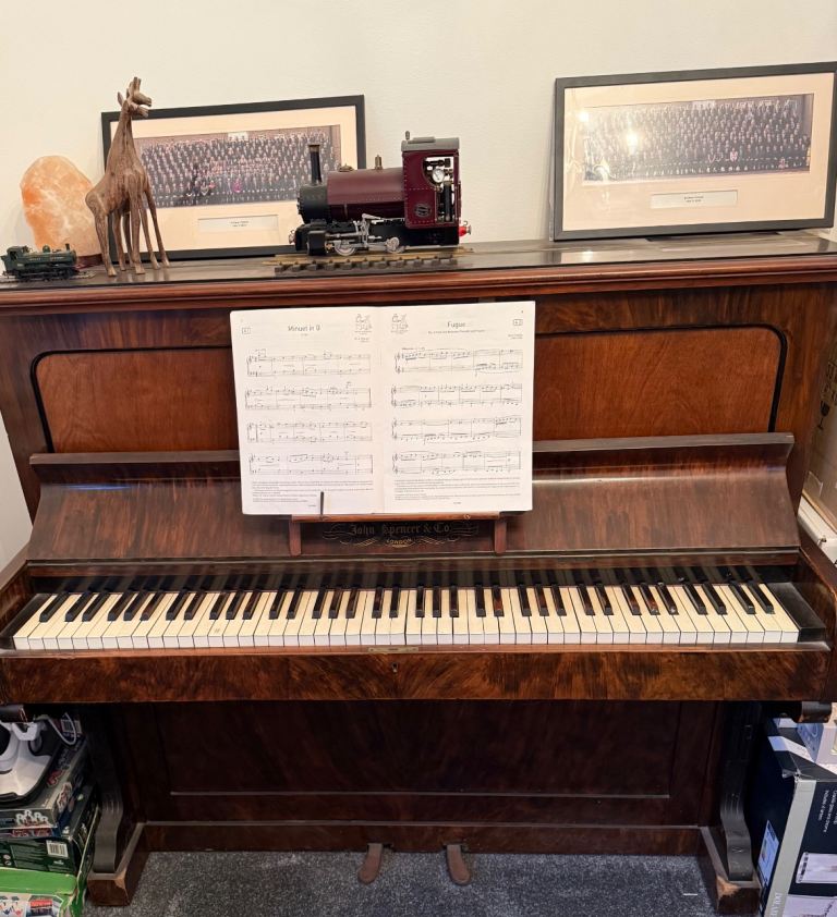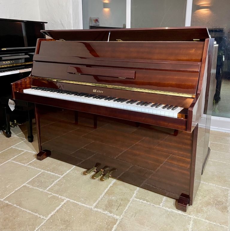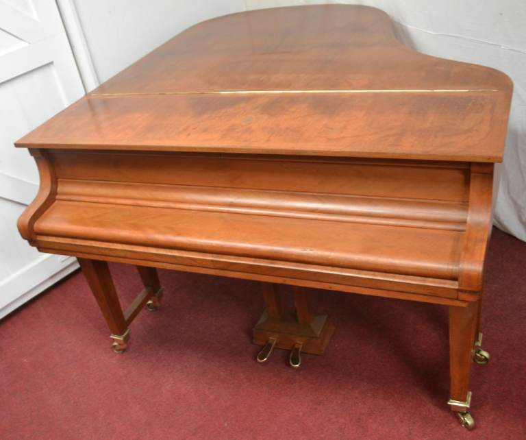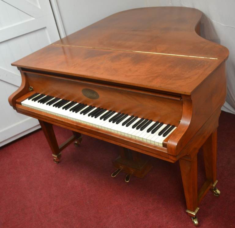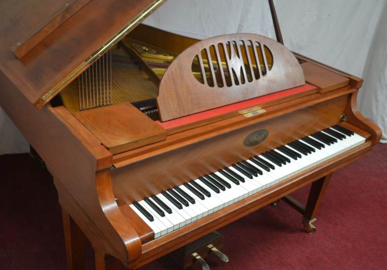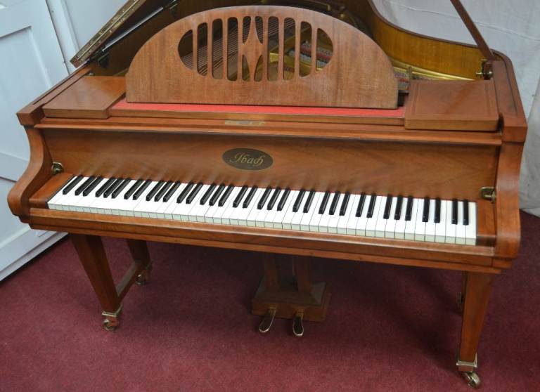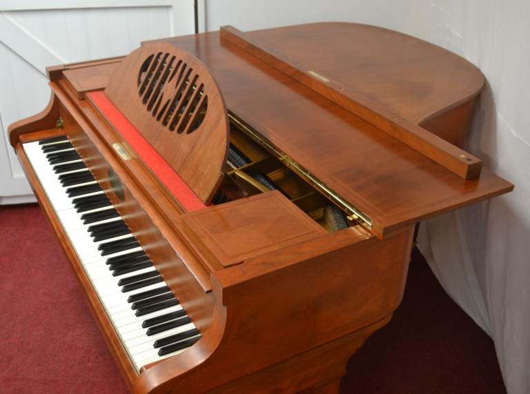 This is a really pretty baby grand piano, with inlayed marquetry designed casework. German made circa 1912 on gate legs. It has lovely Art Nouveau treble over strung iron frame and is in superb condition. It has been professionally cleaned, serviced and tuned to concert pitch. It plays very well and has an even touch and soft tone. This is a lovely item of furniture and a great instrument too. You are welcome to come and try. Delivery can be arranged and is free to local post codes..