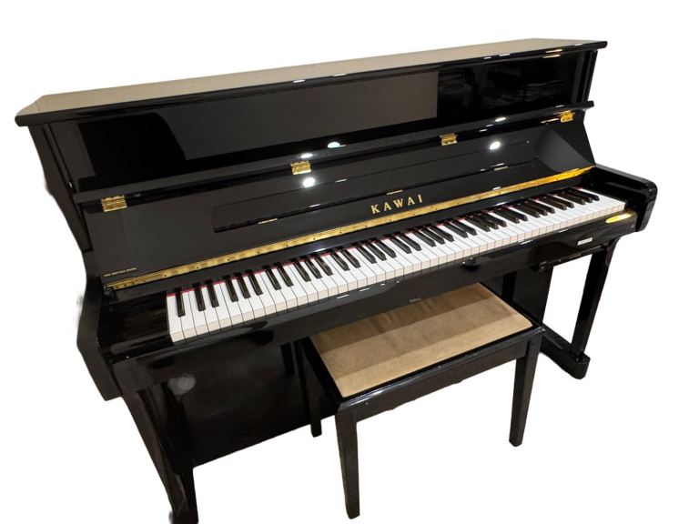 A superb Kawai K2-ATX upright piano, finished in elegant high-gloss black, combining the warmth and responsiveness of a quality acoustic upright with the flexibility of modern silent and digital practice options.