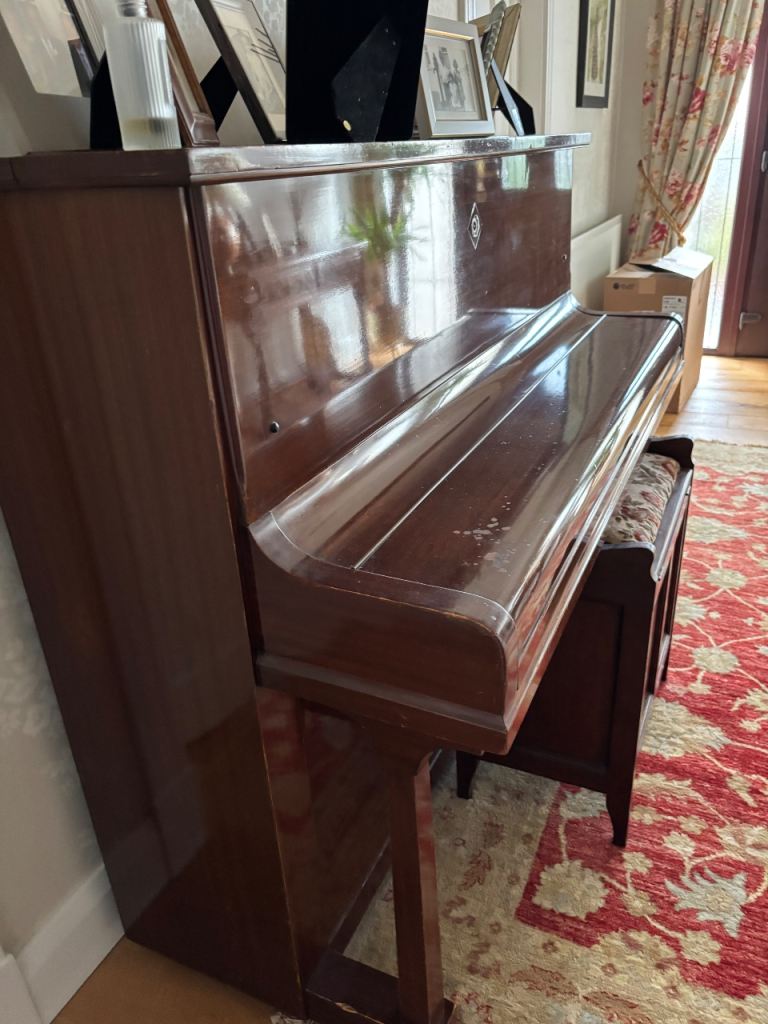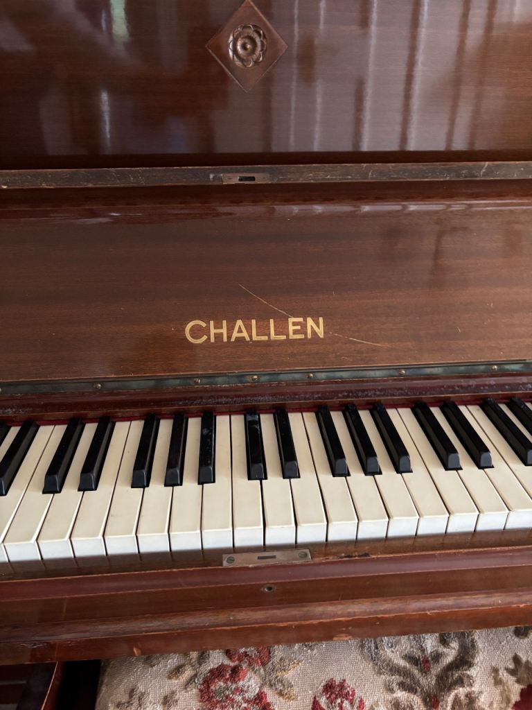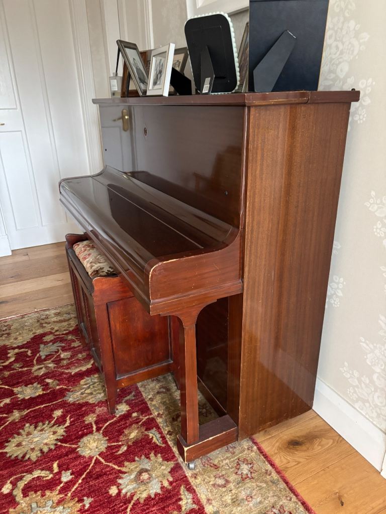 Mahogany piano and stool used by 2 generations of budding pianists. Made by Challen. Good condition for its age. A few marks on piano lid and 2 key tops missing from the far left. Has not been played for some time so will need tuned. Collection only.