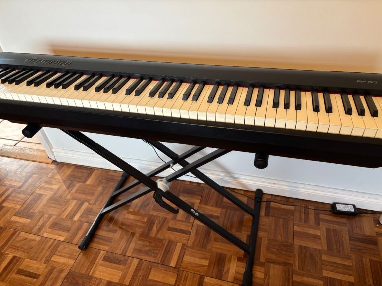 Roland FP30 piano in perfect working order. Has no marks. From a smoke fee and pet free home. Comes with Stagg piano keyboard stand which is fully adjustable allowing the piano to be played while standing up or sitting down. Has had very light use. Selling to buy a different model for recording purposes.