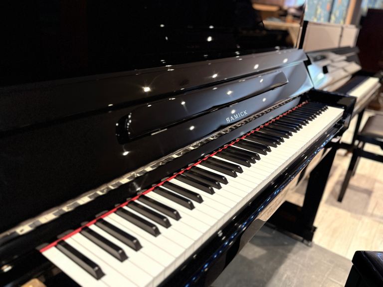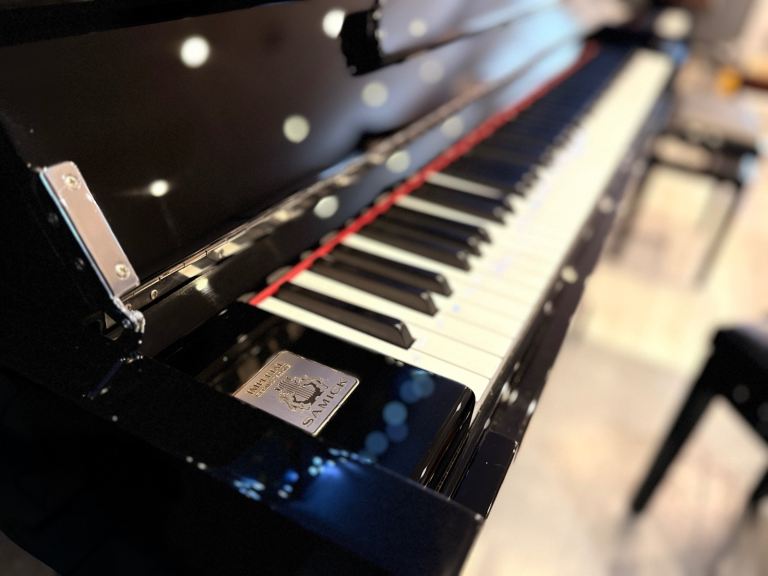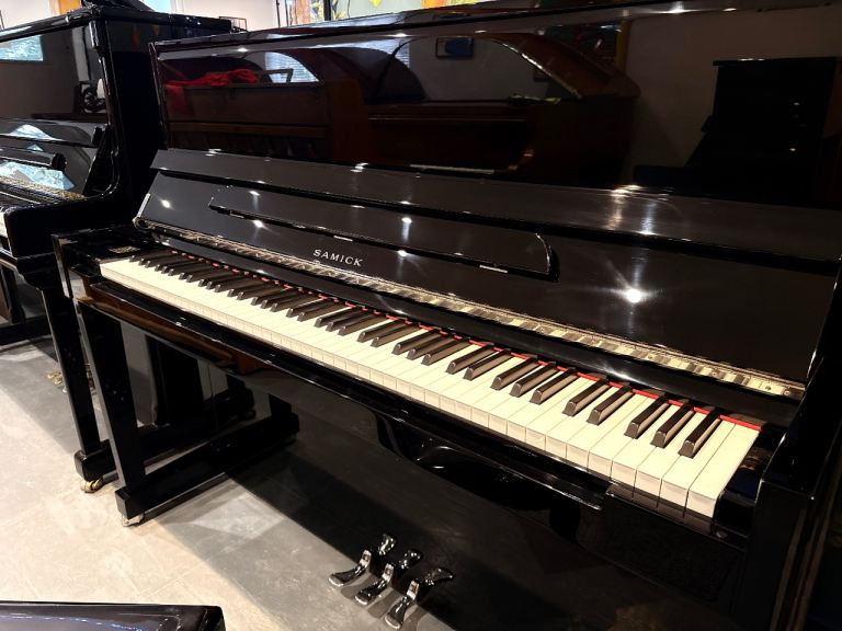 Samick H-118 Modern Upright Piano in Ebony Polish / Chrome (Black Gloss) - Inc Delivery, Stool, Wty
