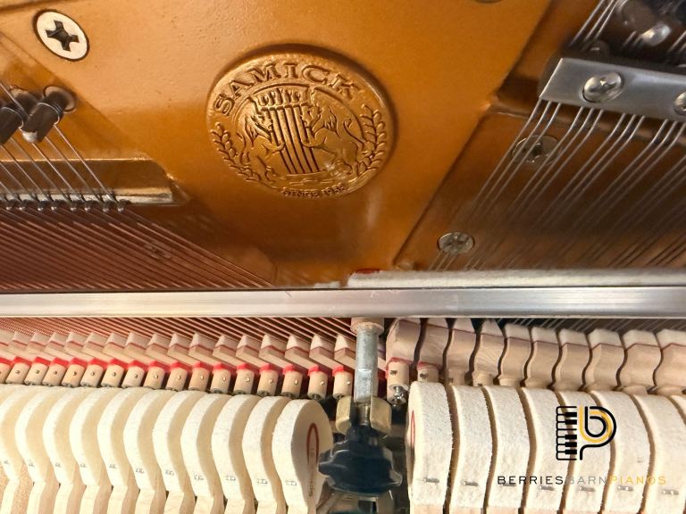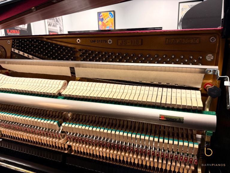 A high quality and stylish modern upright piano, this lovely Samick JS-118 offers a strong and rich tone, robust build quality and a smooth responsive action. Built by Samick in Indonesia in 2004, these pianos are very popular with schools and colleges due to their reliability and excellent value. We think they are very close in quality to their Japanese equivalents but with a much lower price tag. As well suited to beginners or advanced players alike, and with only light use so far, this could be a great option for someone looking for a high quality alternative to the benchmark Yamaha U1 at a much lower price. We usually have several Yamaha U1s in stock for comparison.
