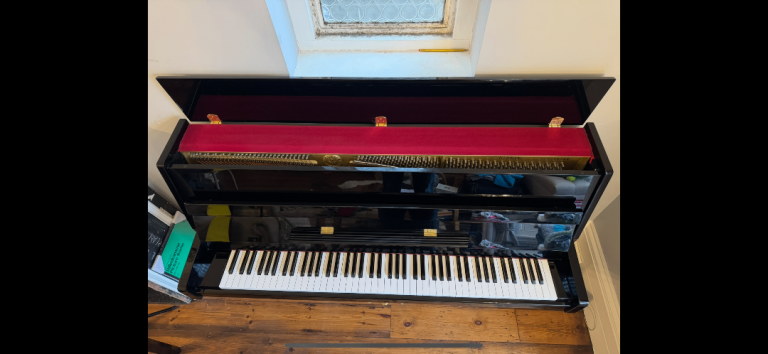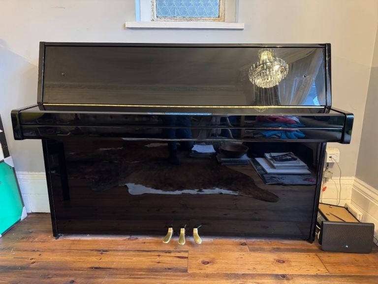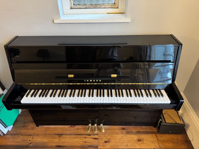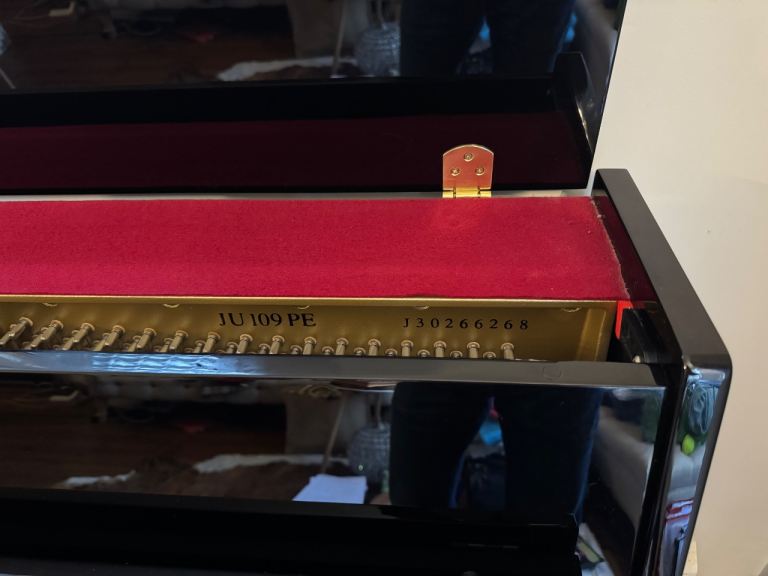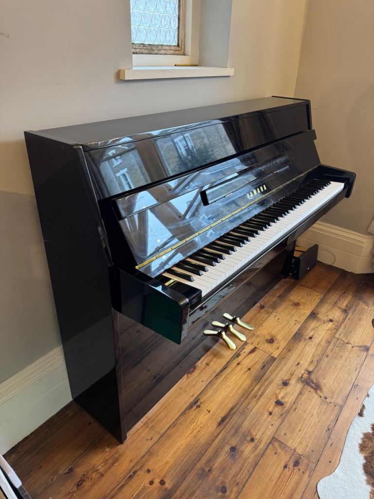 Beautiful Yamaha JU109 upright acoustic piano in polished ebony with brass fittings.