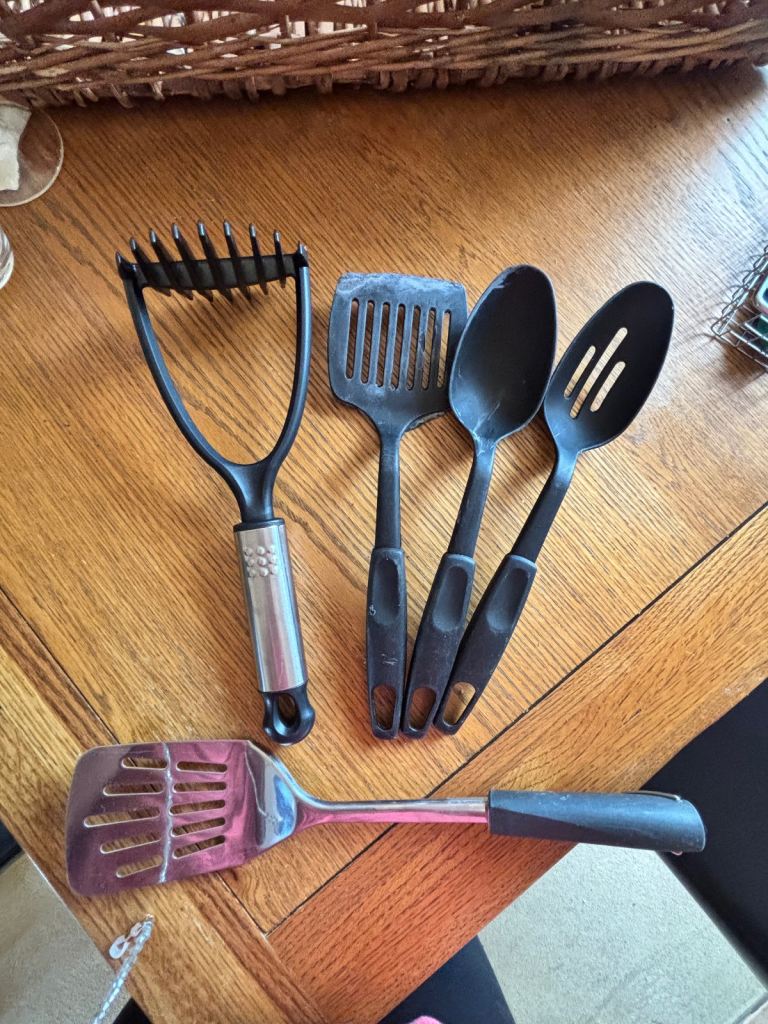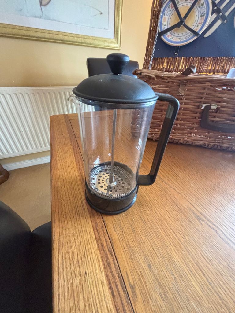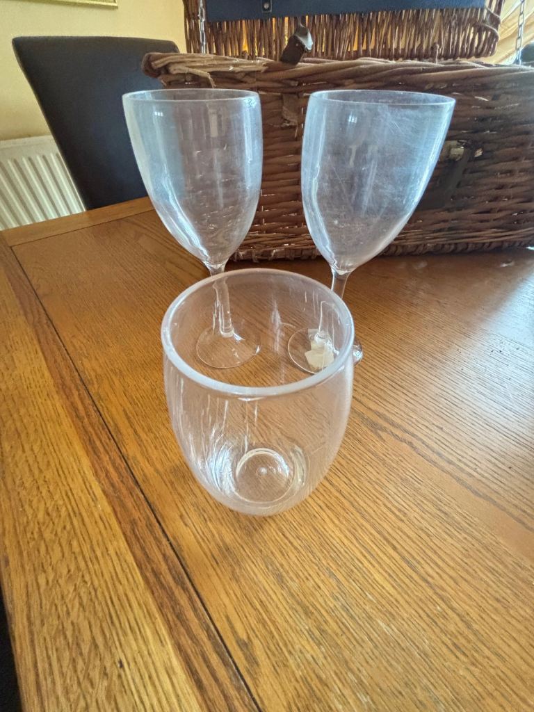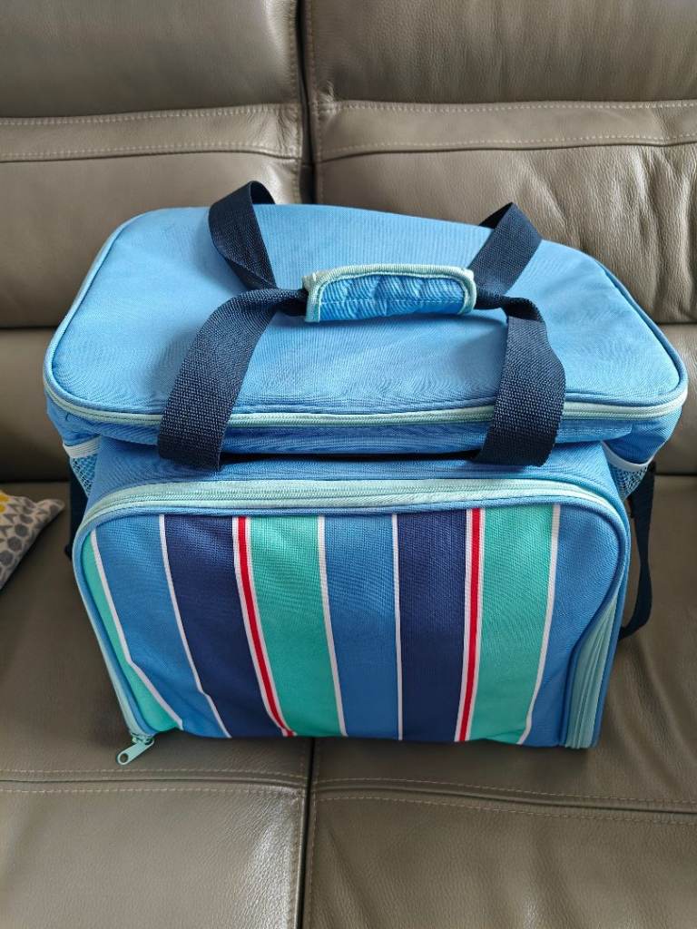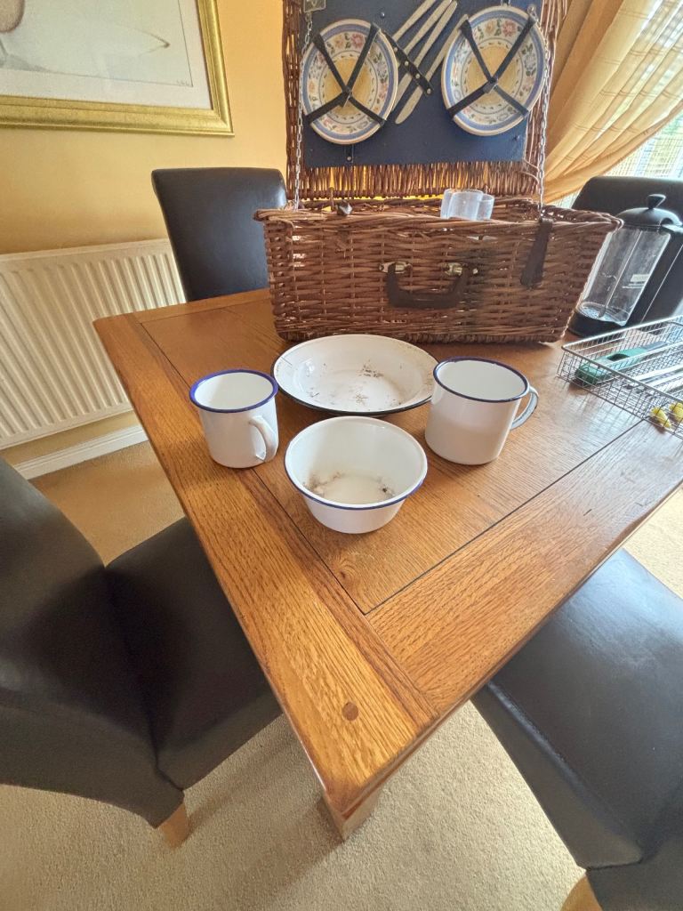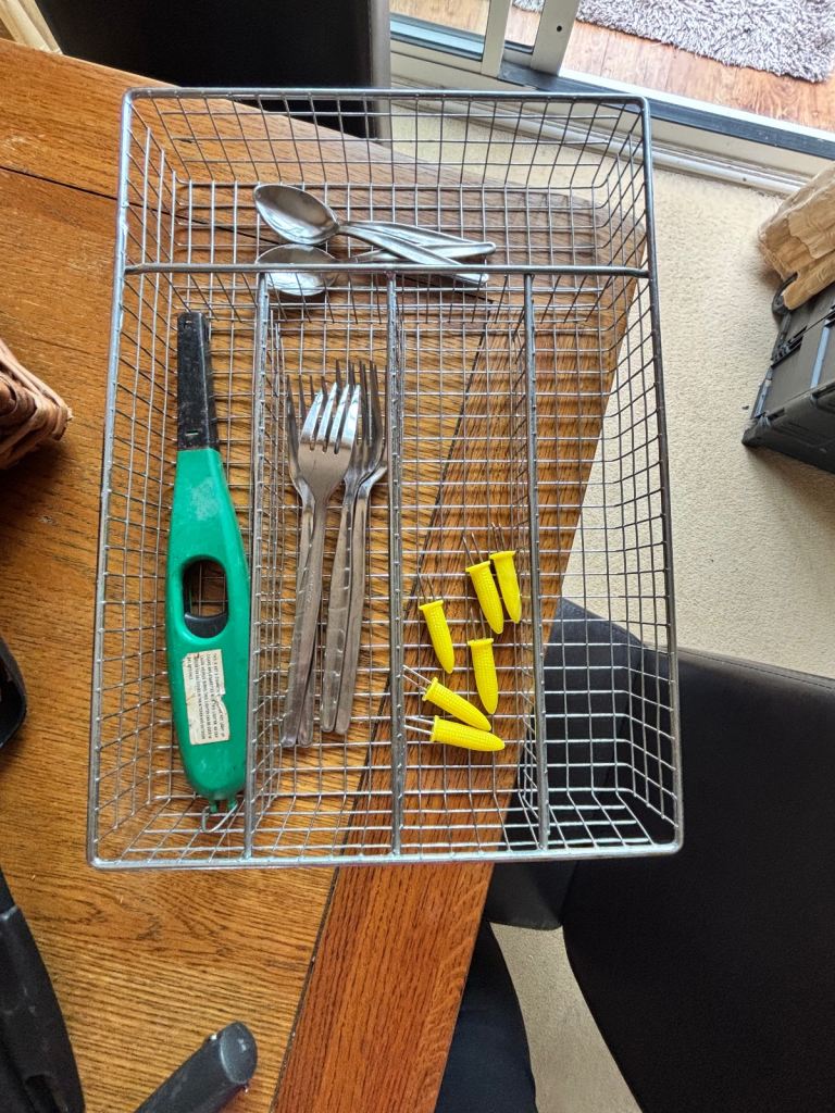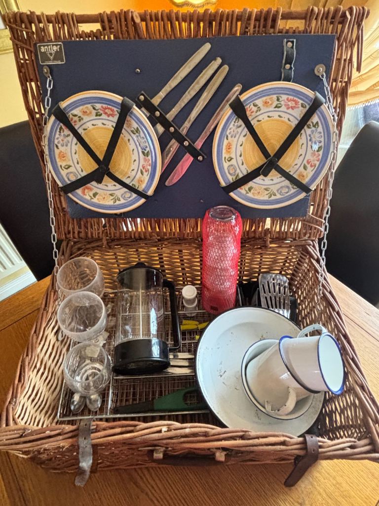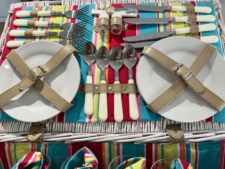 Antler Picnic Basket / Hamper with original plates, cutlery, salt & pepper shaker & 4 glasses. Additional bundle items include: cooking utensils, wire cutlery tray, sweetcorn holders, stove lighter, cafetière, 2 wine glasses & 1 tumbler (Perspex), tin plate, bowl & 2 mugs. Ideal for camping, caravanning.