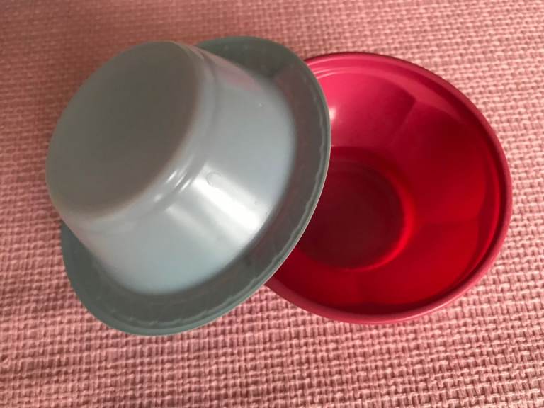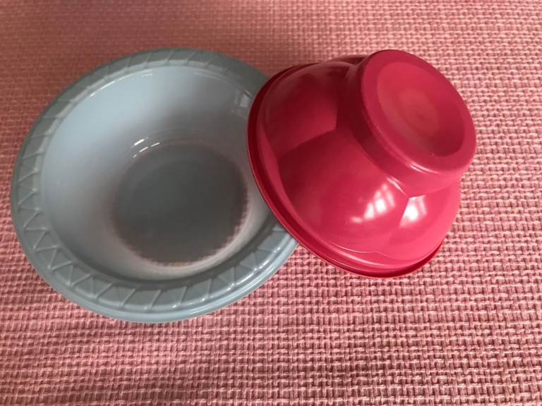 Small plastic bowls for catering or picnics. There are 11 pink ones, which are dishwasher-safe; diameter at the top 10cm. There are 35 blue ones, which are not dishwasher-safe; diameter at the top 12cm. The lot for £1.