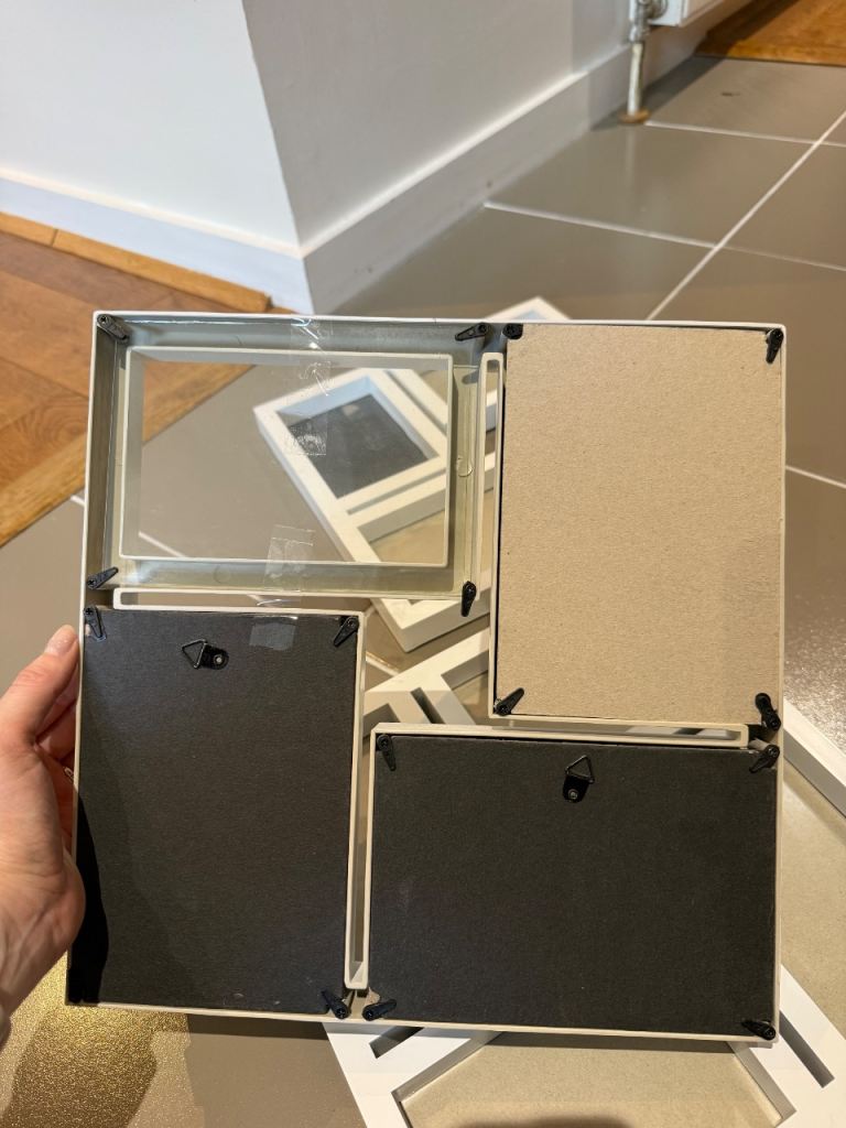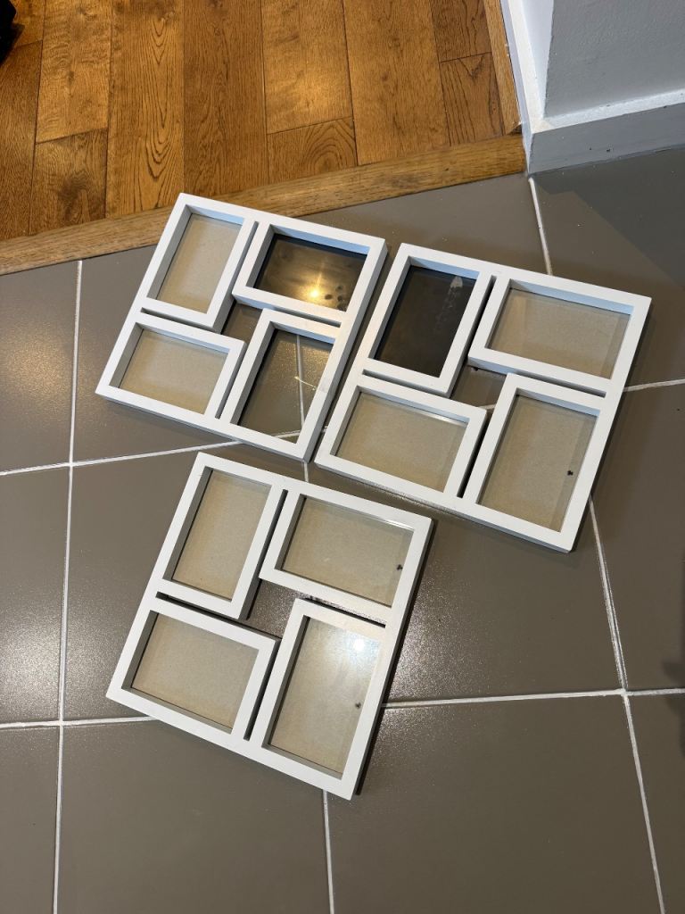 3 x white 30x30cm photo frames. One of the frames is missing the card backing - see pics