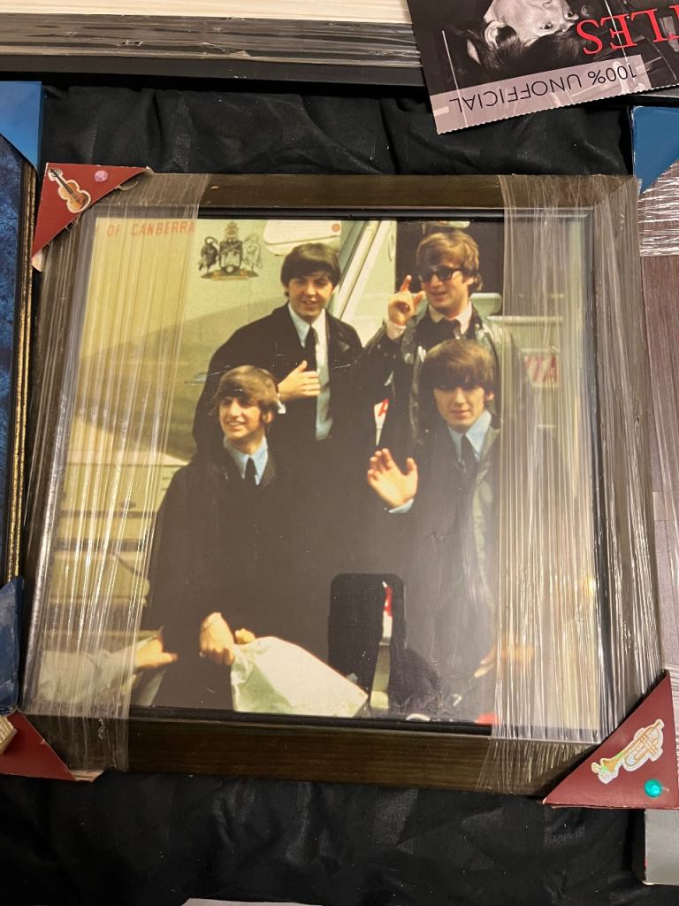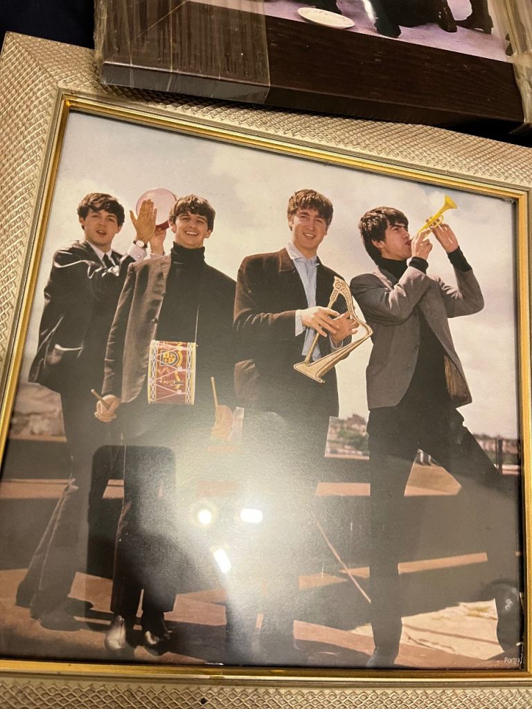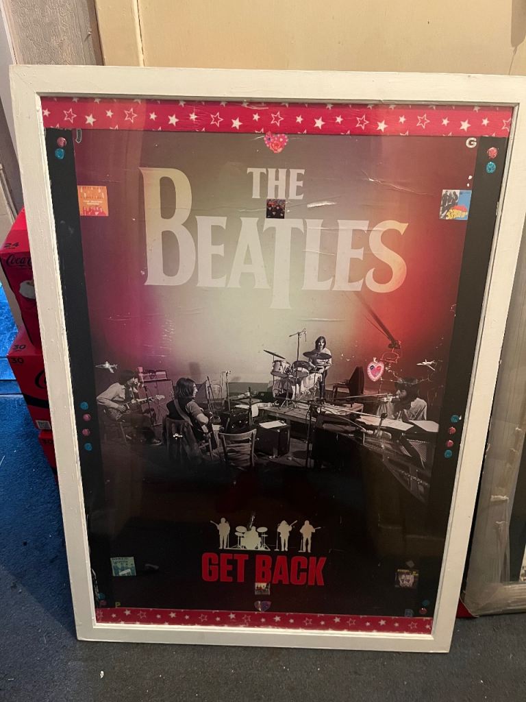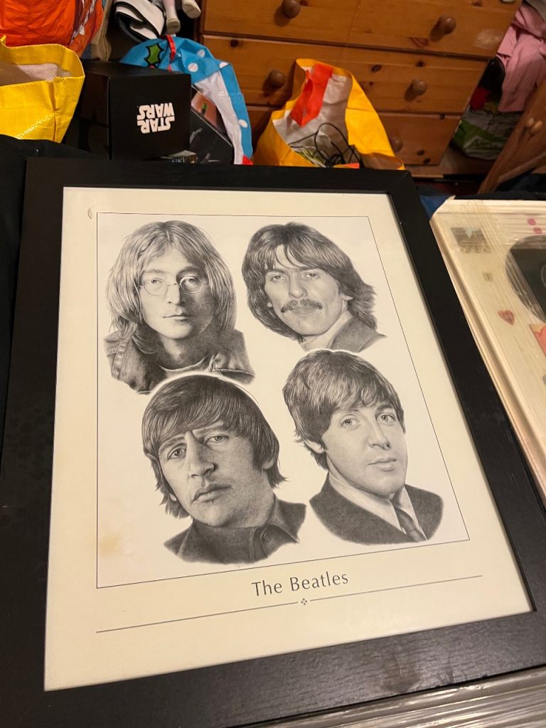 Large amount of framed Beatles pictures great selection everyone different & 2 Beatles carrier bags unused and a callender front one of the pictures has cracked glass last picture in collection so be careful if going to replace glass welcome to view afternoon/evening in mospark no posting no PayPal no transfers there is about 12 in total great for personal collection or even resale also have 2 large pictures advertised