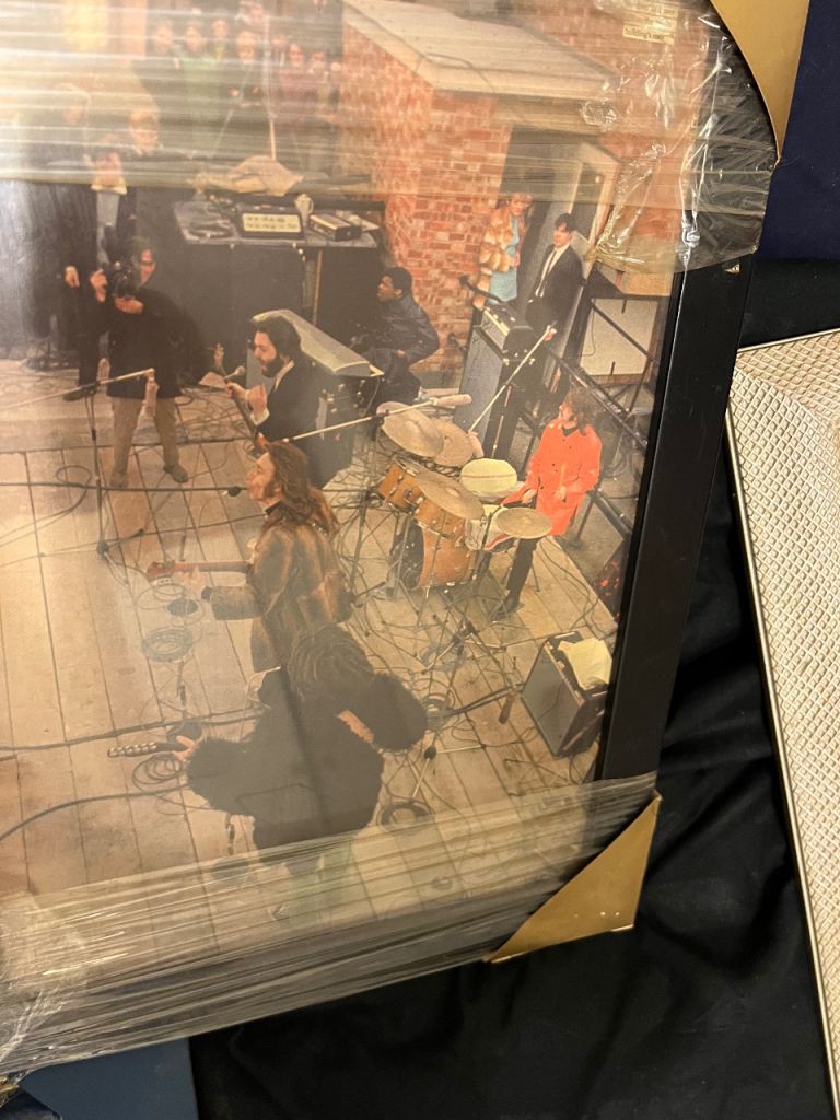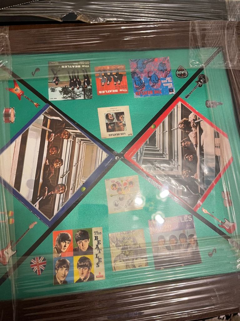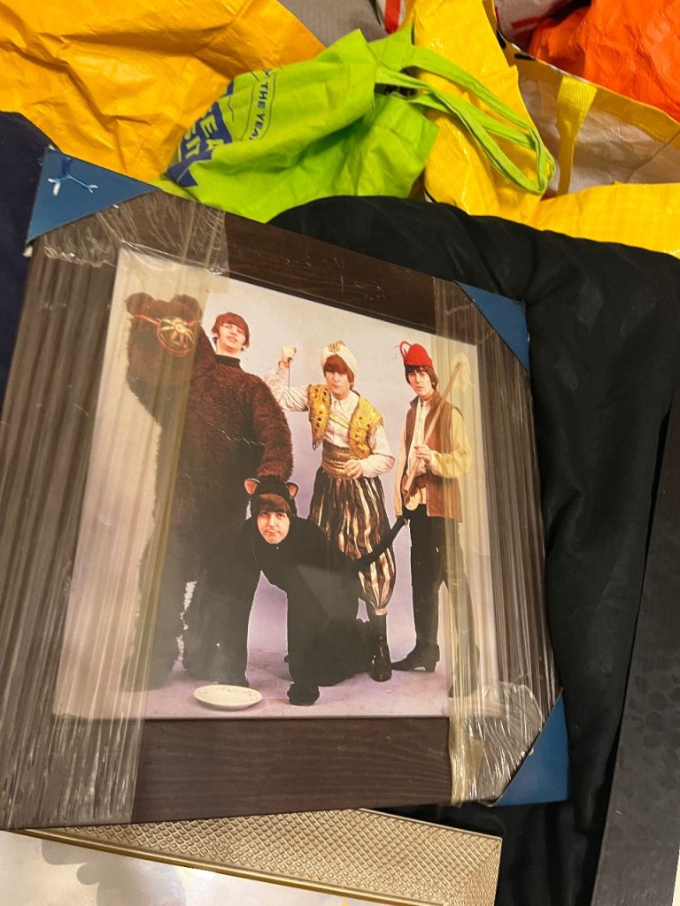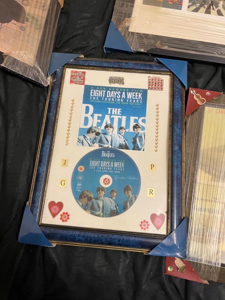 Large amount of framed Beatles pictures great selection everyone different & 2 Beatles carrier bags unused and a callender front one of the pictures has cracked glass last picture in collection so be careful if going to replace glass welcome to view afternoon/evening in mospark no posting no PayPal no transfers there is about 12 in total great for personal collection or even resale also have 2 large pictures advertised