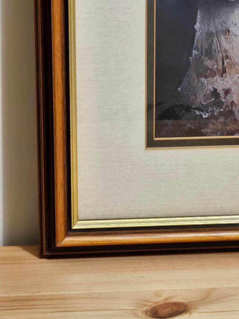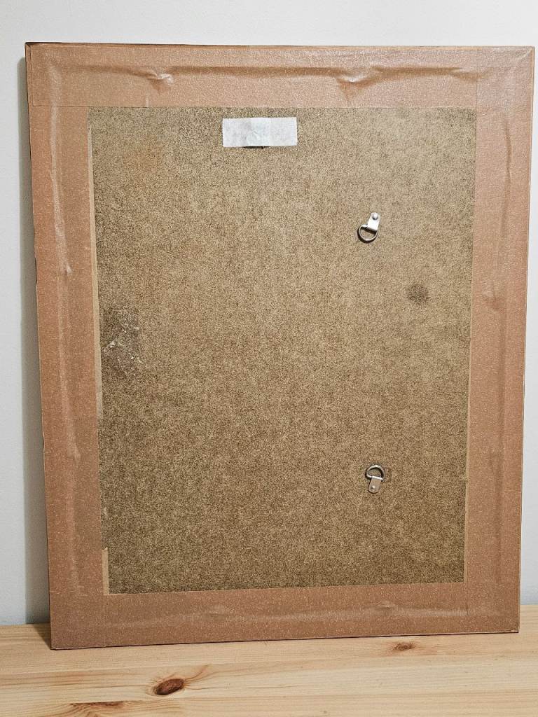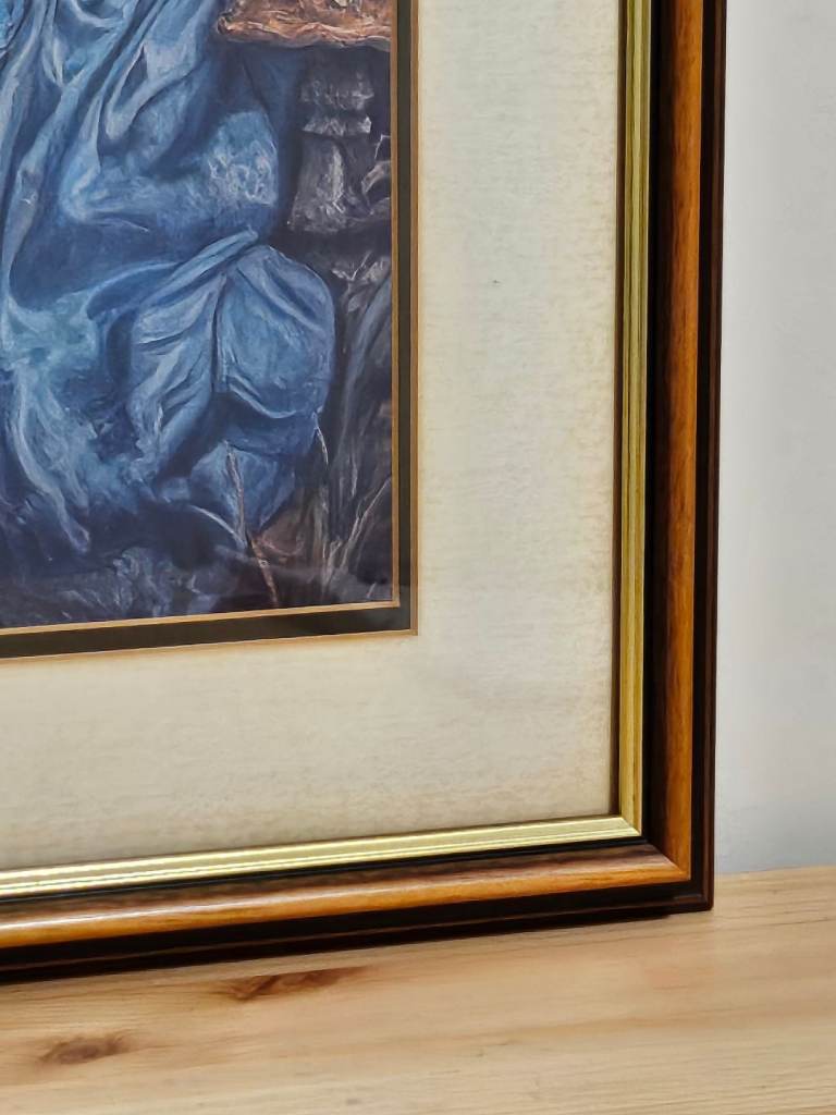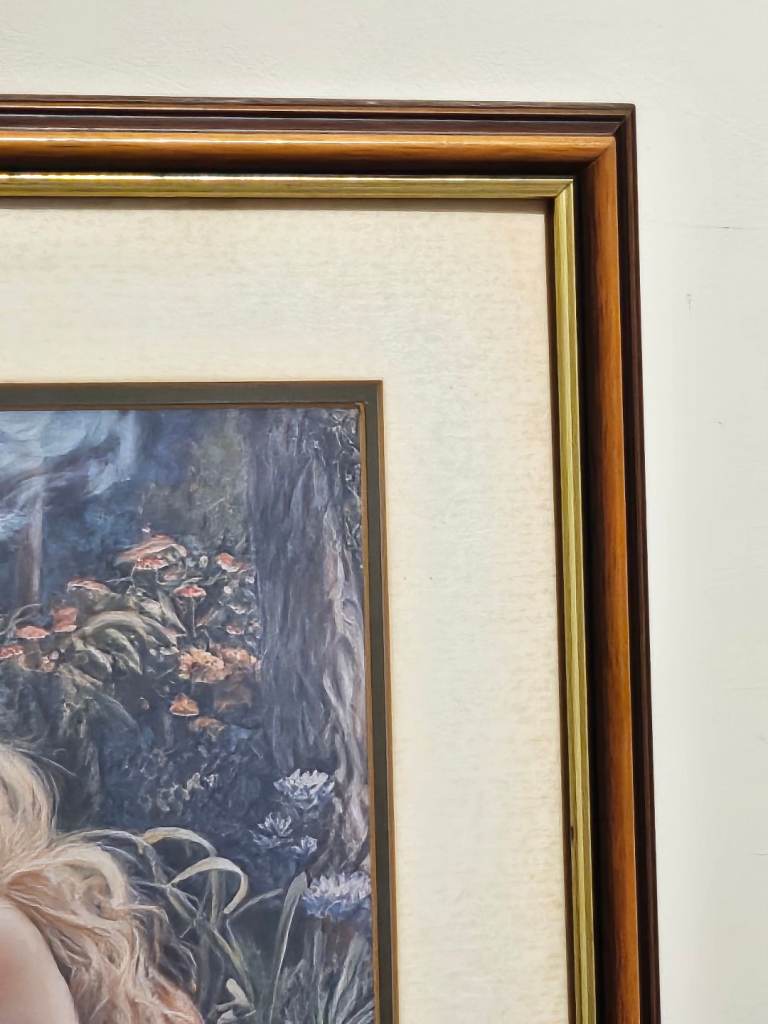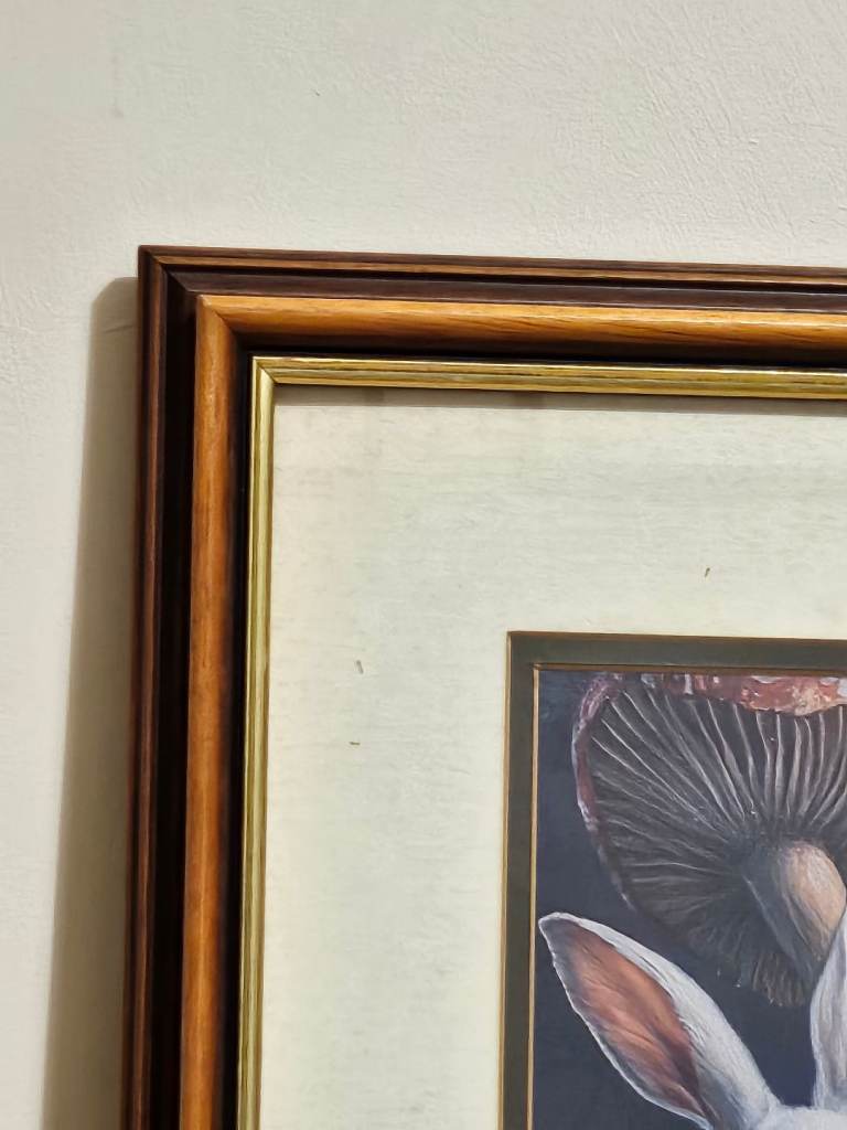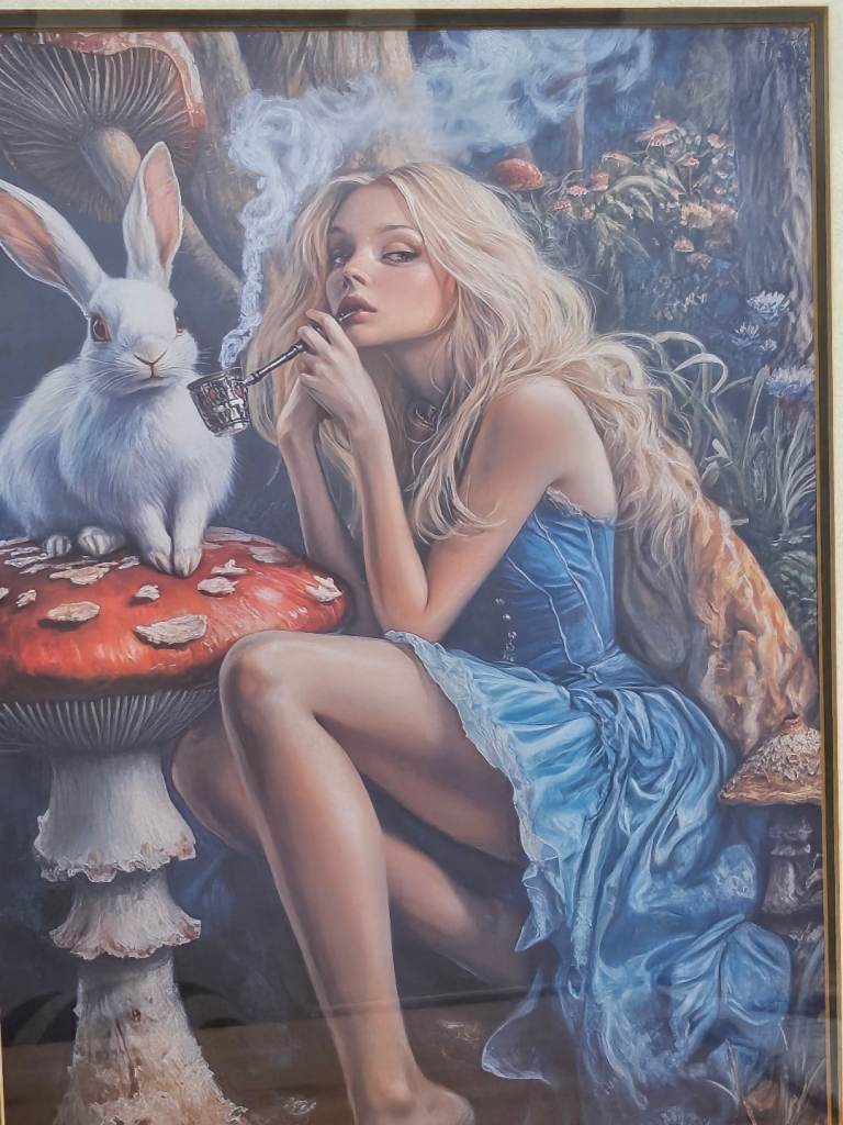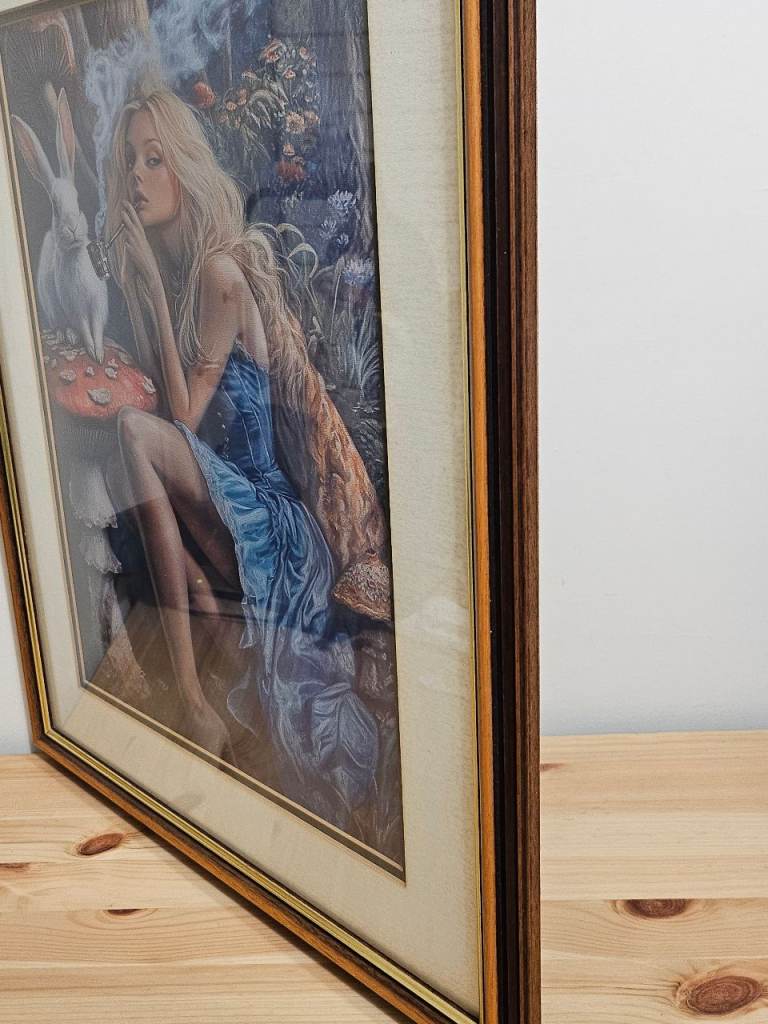 A canvas print of 'naughty' Alice in Wonderland and White Rabbit mounted inside a large wooden frame with gold coloured inner trim. Size of frame 45cm x 55cm. Canvas is new, frame is vintage. Solid real wooden frame, cardboard mount and real glass. Unusual and very attractive, a definite talking piece for any room.