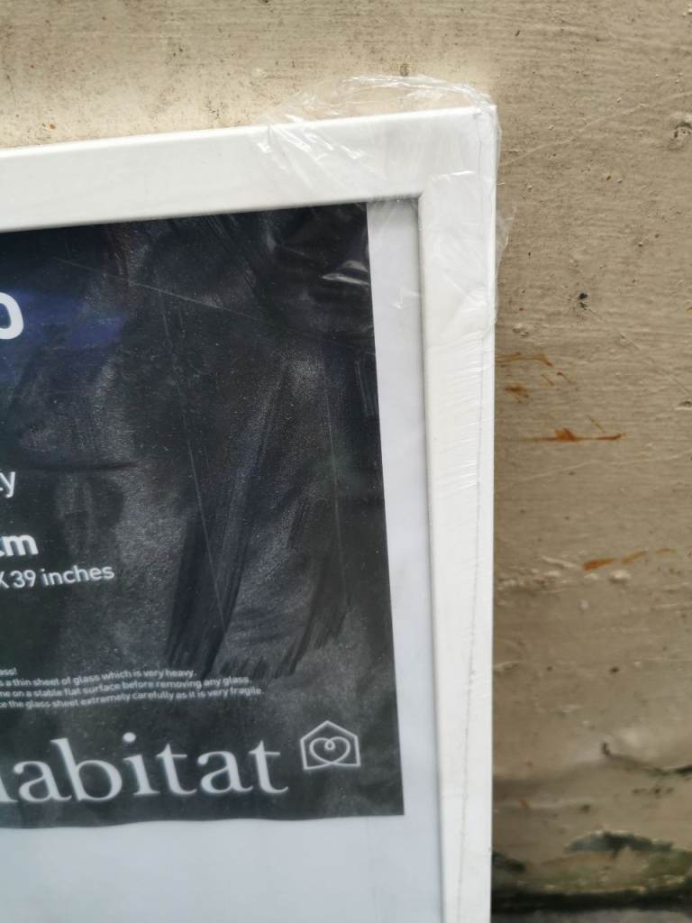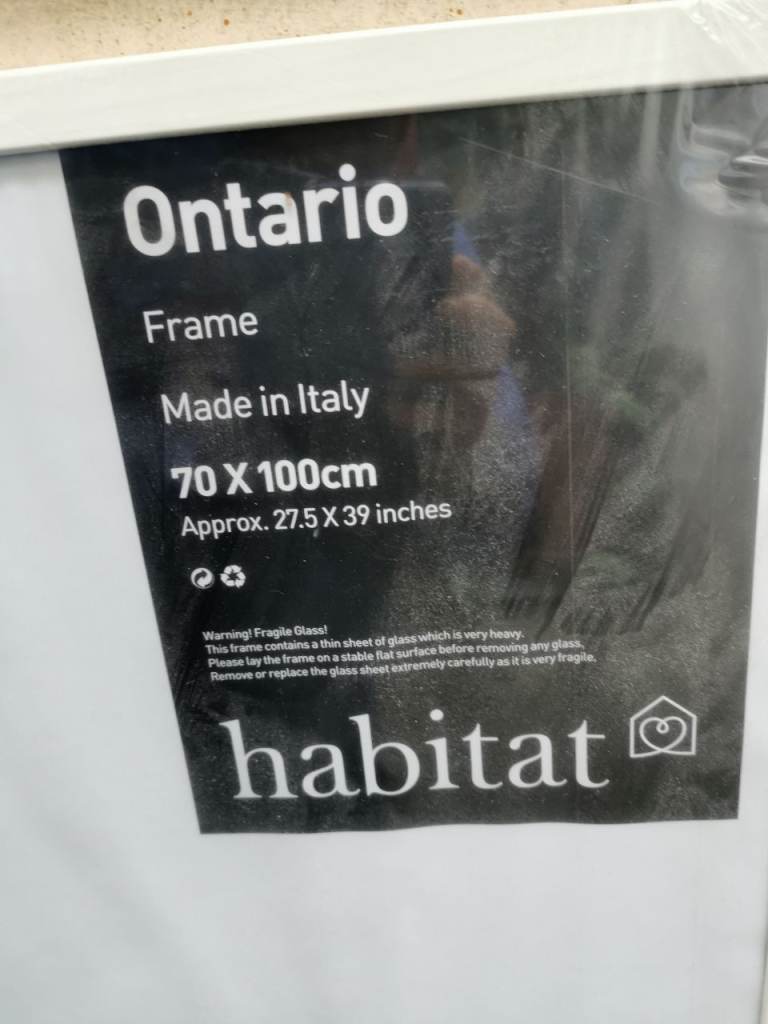 This large frame from Habitat is an Ontario model made in Italy. 70x100 cm or 28x39 inches. Width or depth of the frame 1.7 cm, 0.5 inches. Well made frame with excellent backing and can hang on Portrait or landscape. It has the hooks for either. Completely new, still with the plastic wrapping all around. Too big for our flat. Thin glass and wood frame all around, thin wood backing too. #GotStuffGetCash. 10% off when you buy more than 1 item.