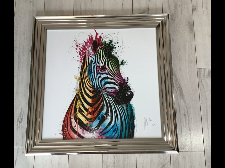 Multi Zebra framed art, cost £199 from Furniture Village, measures 85cm x 85cm. Stunning framed print of a zebra. In a high quality unmarked metallic effect frame. This striking print is reproduced and mounted under glass, the glass embellished with hand applied liquid art. A feature in any room.