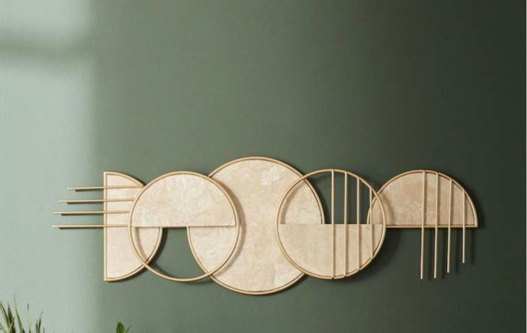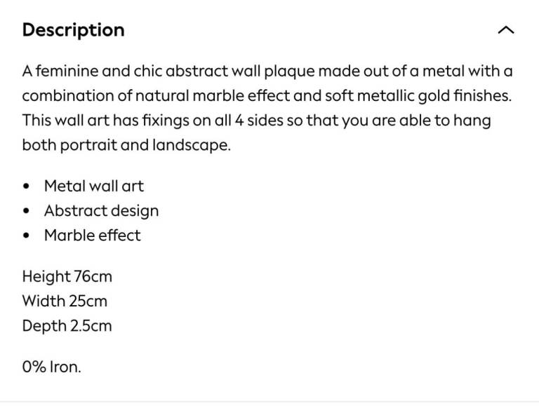 Next metal wall art made out of metal with a combination of natural marble effect and soft metallic gold finish. Has fixings on all 4 sides so that you can hang landscape or portrait