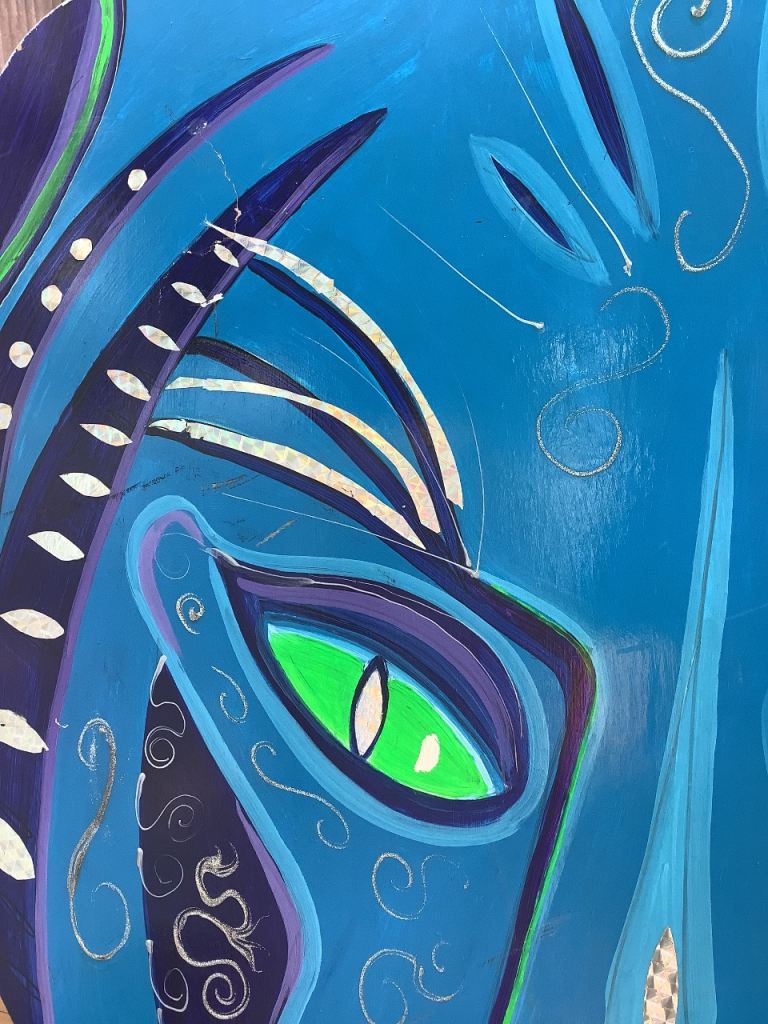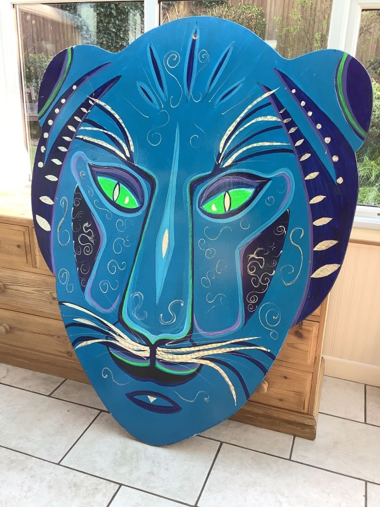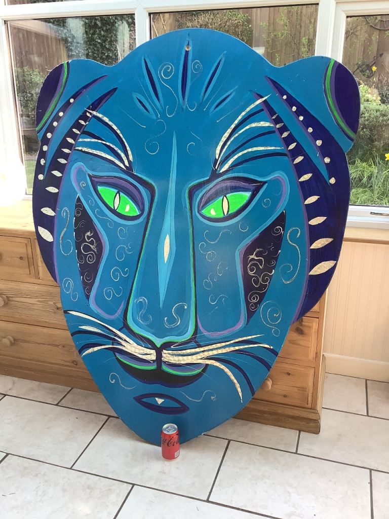 ANIMAL FACE/MASK - PROP- THEATRE - MAN/GIRL CAVE! WELL PAINTED ON 1 cm THICK WOOD. MEASURES 153cms TALL x 120cms AT WIDEST POINT. VIBRANT AND DECORATIVE. PLEASE SEE PHOTO 5 TO GET AN IDEA OF JUST HOW BIG IT IS NEXT TO THE CAN! COUPLE OF BLEMISHES BUT GENERALLY IN GOOD SOLID CONDITION. £45 OVNO COLLECTION ONLY.