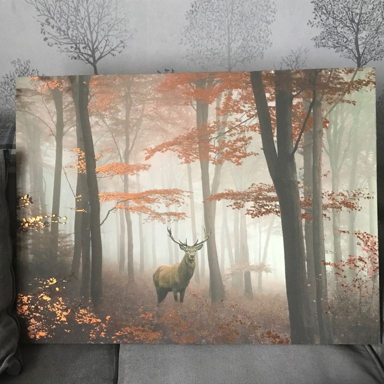 Selection of 7 canvases. $ individual, and 3 that make up one larger image. Features of tranquil woodland, trees and river. The other features a Dear in the woods, this has like gold leaf on it that shines. Bargain £30 the lot.