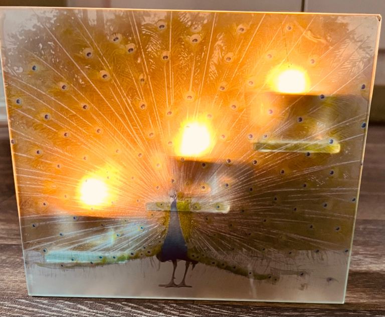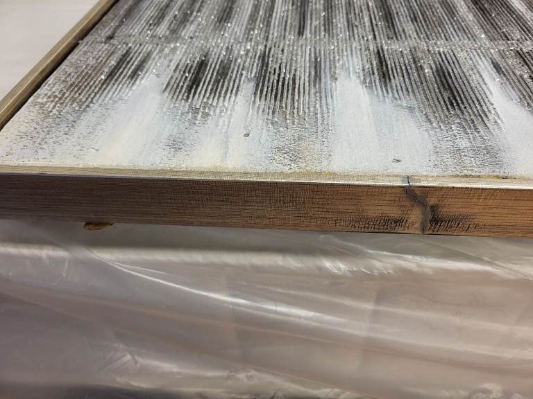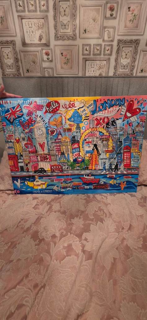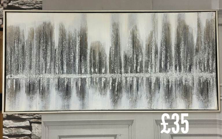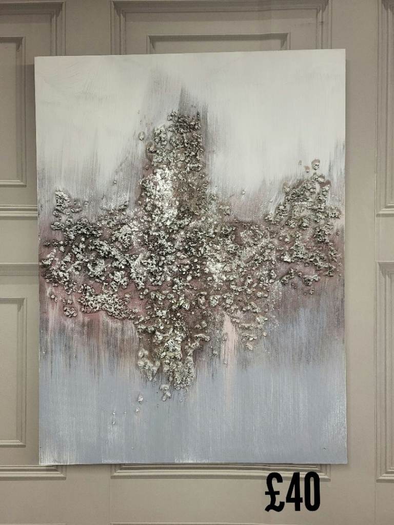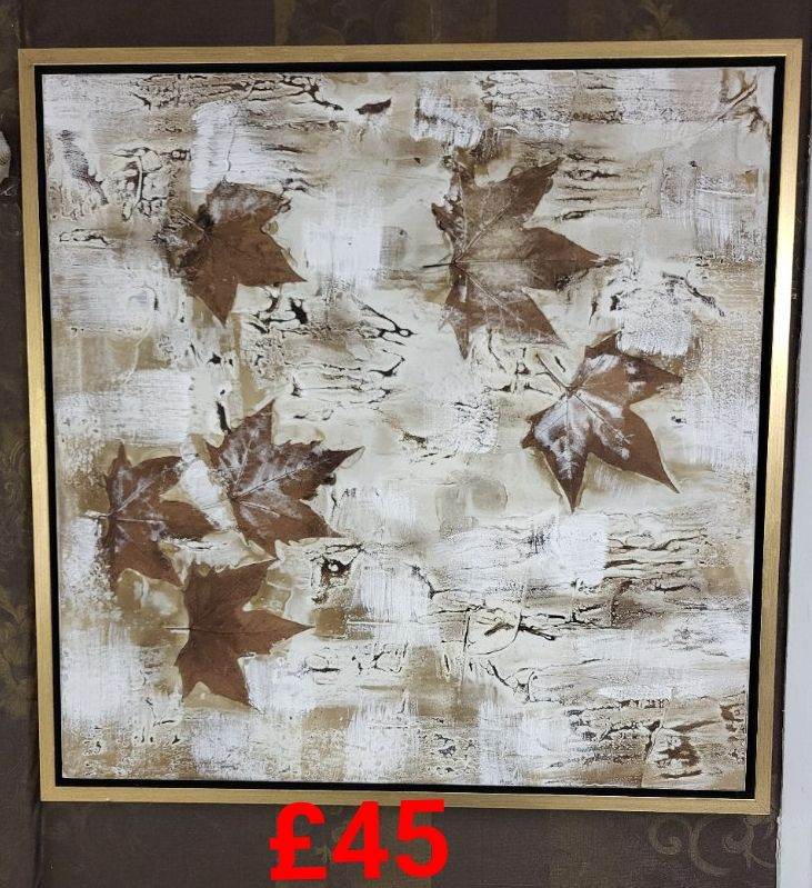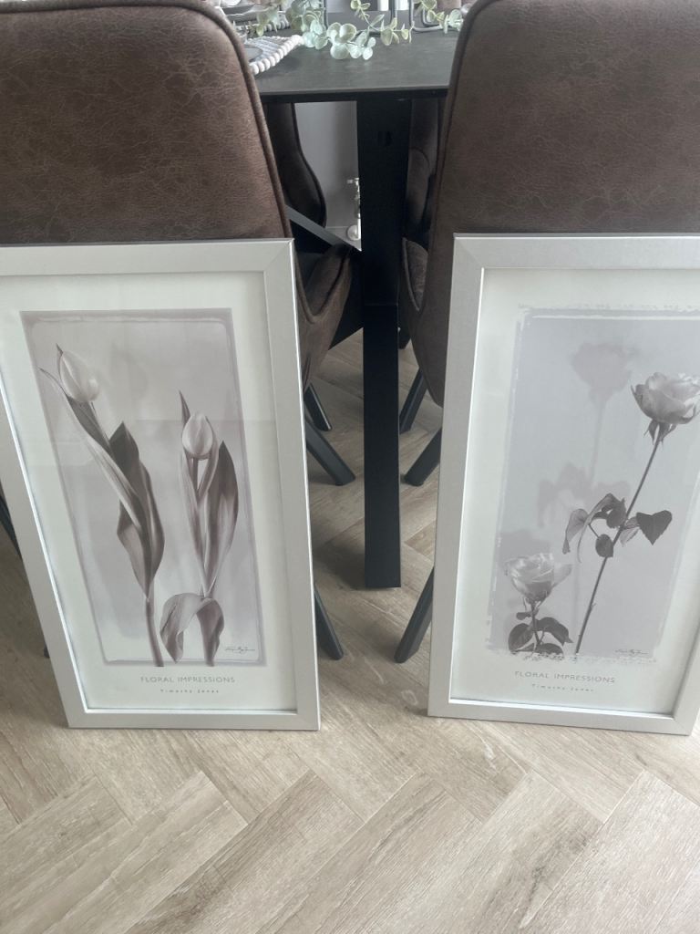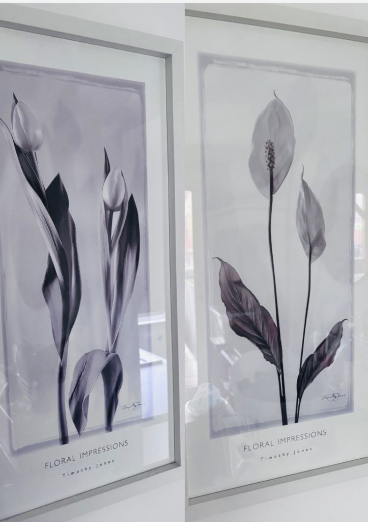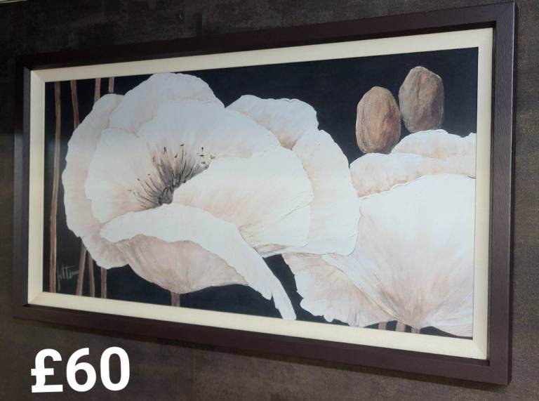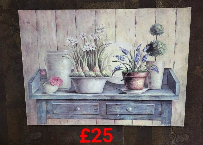 Featuring a still life painting of potted flowers on a wooden sideboard