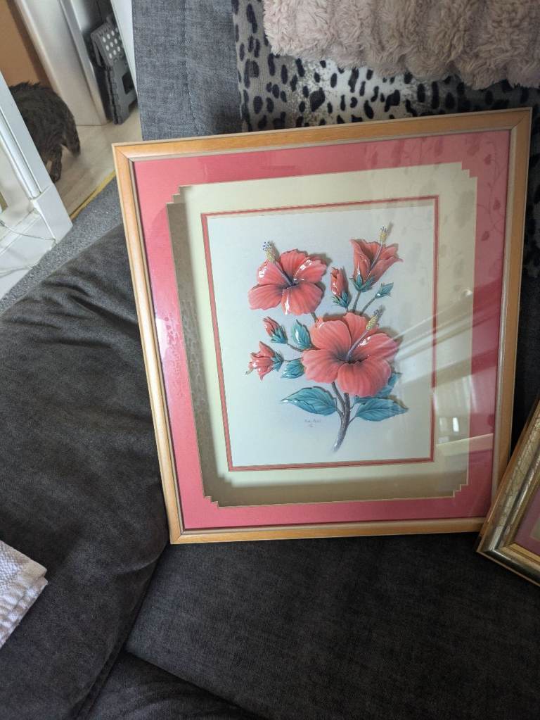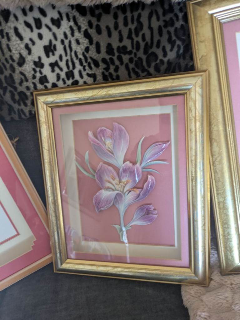 They are all decoupage, in gold coloured frames flowers are lillies and hibiscus . All in good condition.
