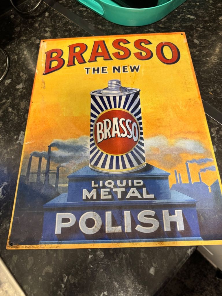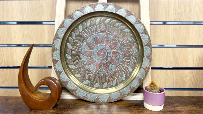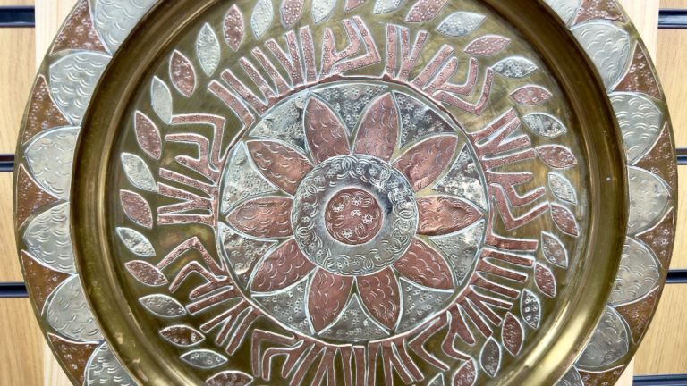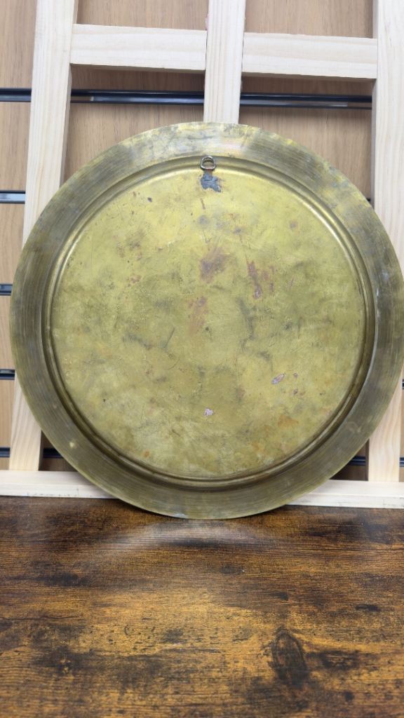 * The plate is made from a combination of brass with copper and possibly white metal (silver-colored) inlay.