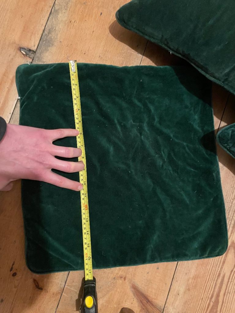 3 dark green cushion covers, but only two cushions so you’d need to find an extra inner to fit. Square, and measurements in pic.