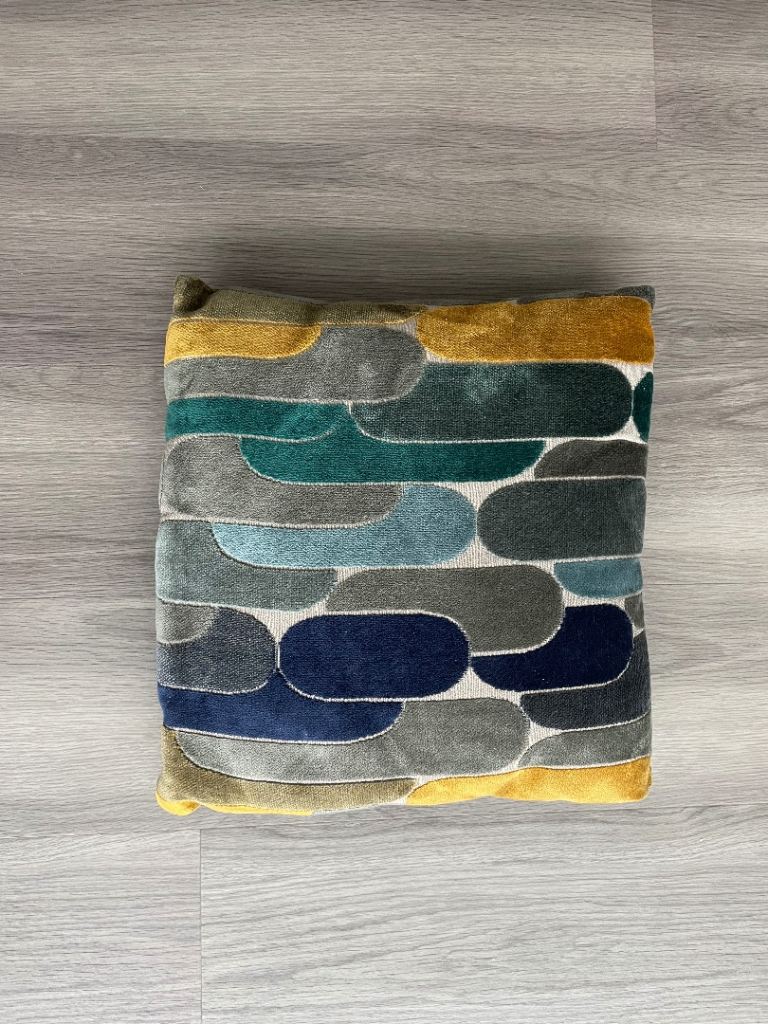 Fun multicoloured fabric cushion with Christmas dogs design.