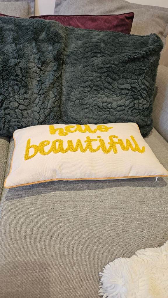 Decorative sofa cushion with the wording “Hello Beautiful” in a lovely yellow and cream colour. Super soft and comfy, perfect for a sofa, couch, or bed. Adds a warm, cheerful touch to any room and works beautifully as home decor or a cosy accent cushion.
