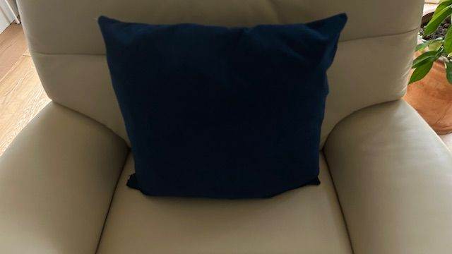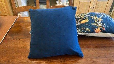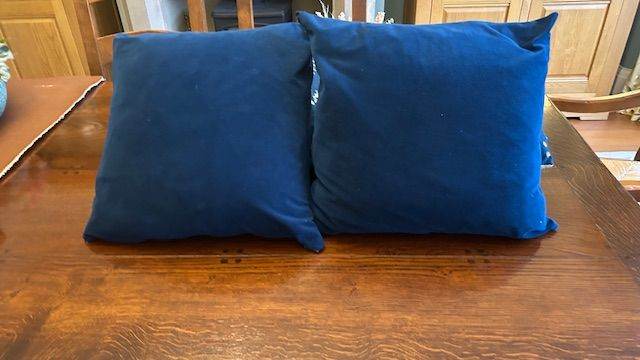 Four velour cushions with real feather cushions inside. Two blue floral covers and two blue plain covers. Originally bought from IKEA. Measurements are 50cm by 50 cm. Very good condition. No marks on cushion insides or covers. Zip fastenings on cushion covers. Selling due to change of colour scheme.
