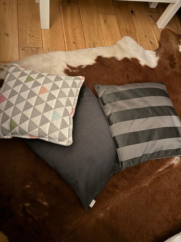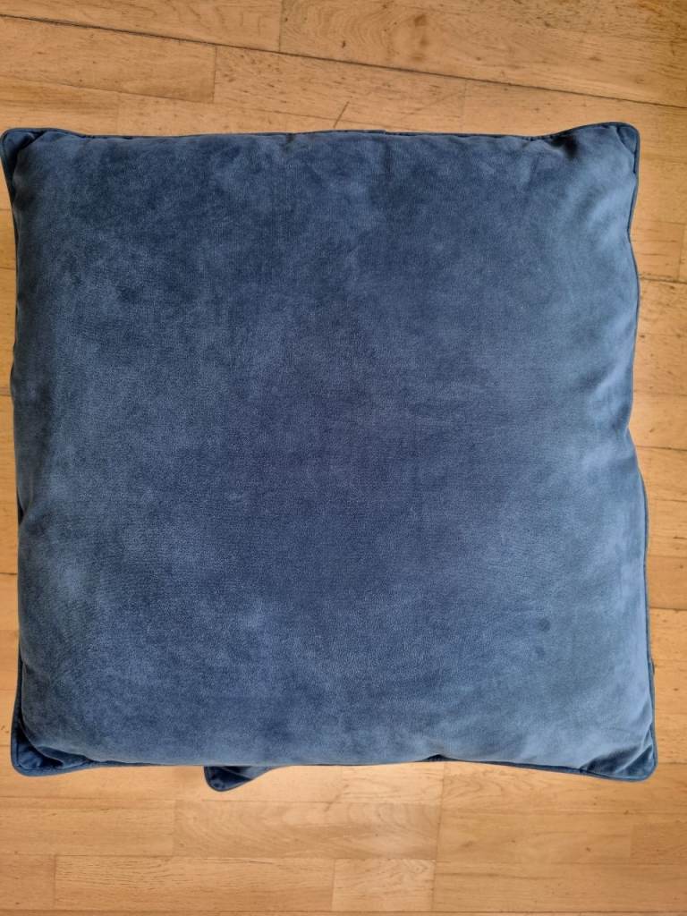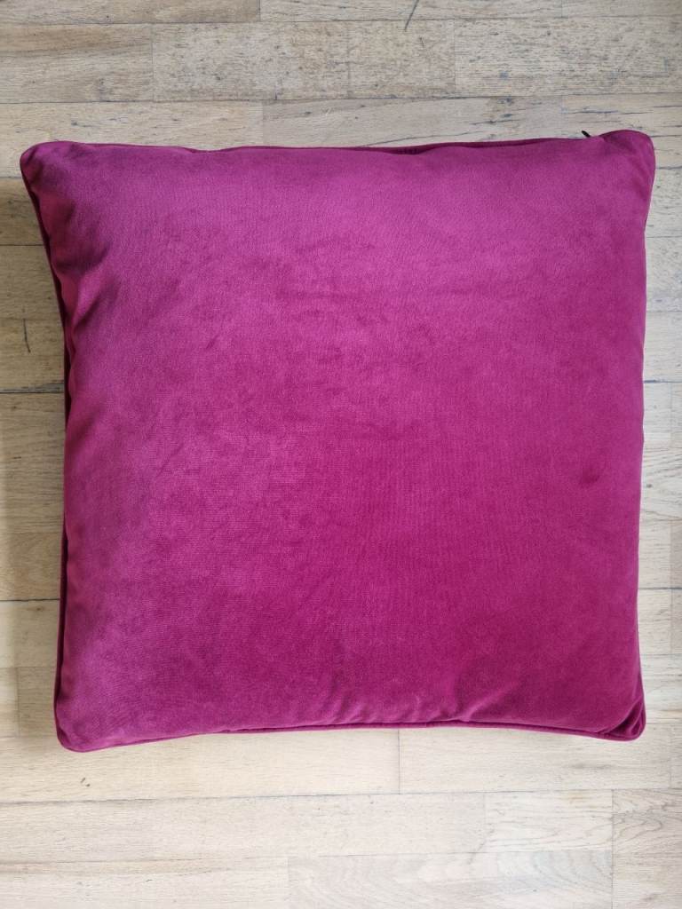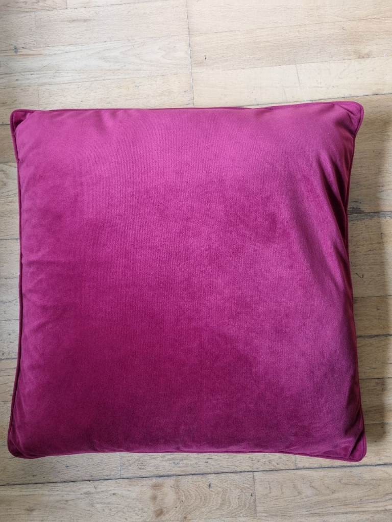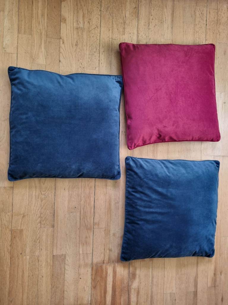 3x large cushions. Soft velvet-like feel. 100% polyester covers and filling. Removable covers which are machine-washable. 55x55cm.