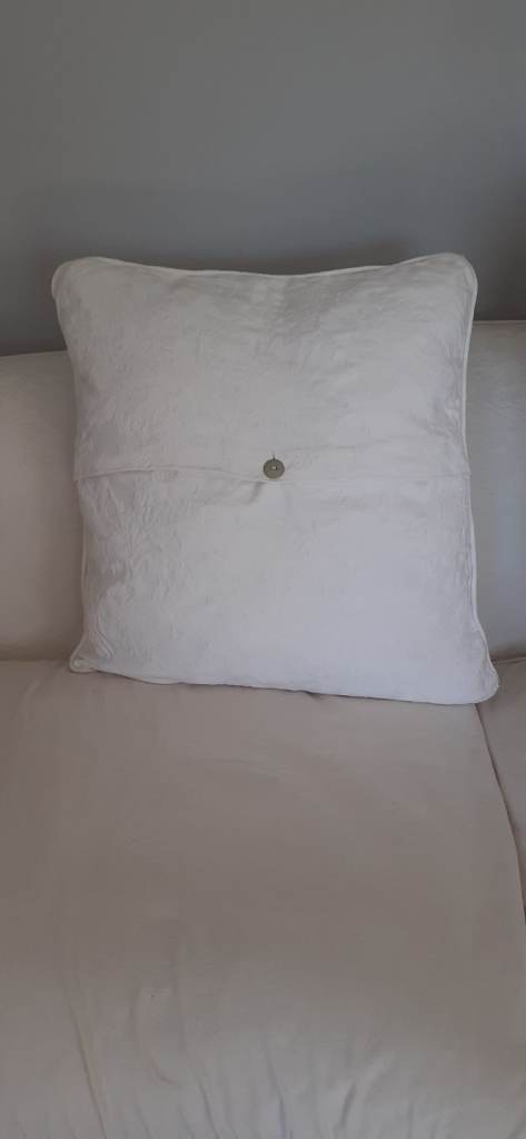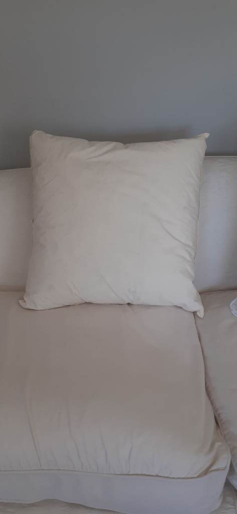 3 large cushions (approx 22" x 22") (56cms x 56cms). Washable covers (just washed today!). Cream colour with back button closure. Duck feather luxury filling internal pads very soft and comfortable. Pads alone excellent value. Separate pic of cushion pad illustrates. Condition given as good due to slight wear at corner of cover (see pic).