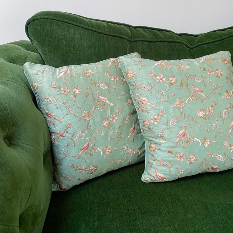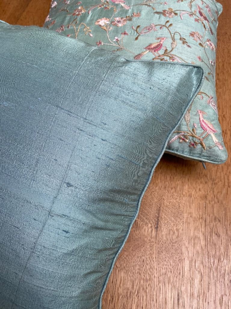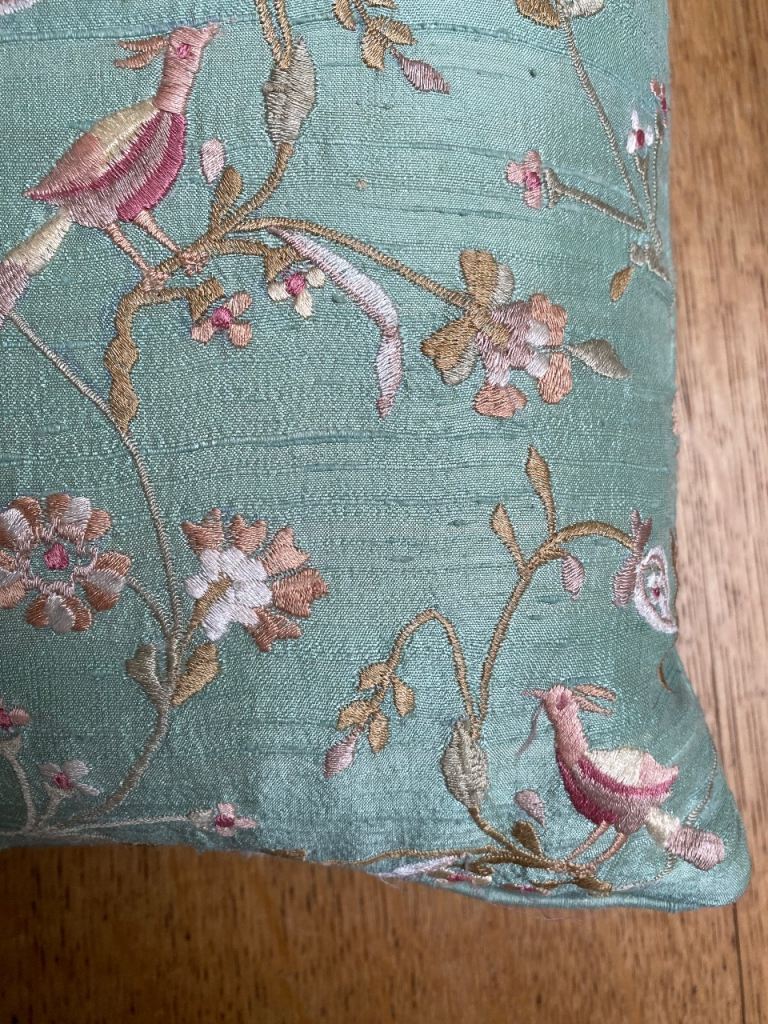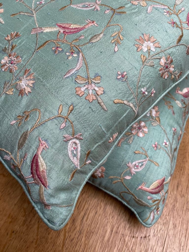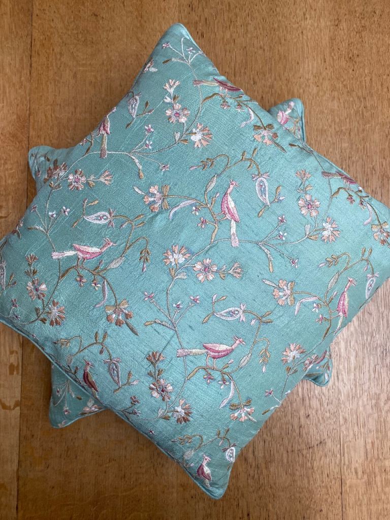 A pair of Indian scatter cushions finished a Pastel coloured Teal Dupion Silk with piped edging and intricate Embroidered decoration in delicate tones of Dusty Pink and Light Coffee. The embroidery decoration includes birds of paradise and tropical foliage. Both cushions are both filled with plump Jonelle (John Lewis) branded curled feathers inners.
