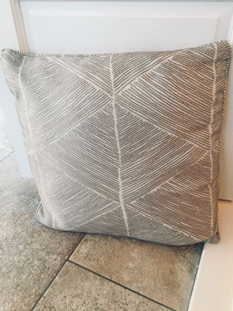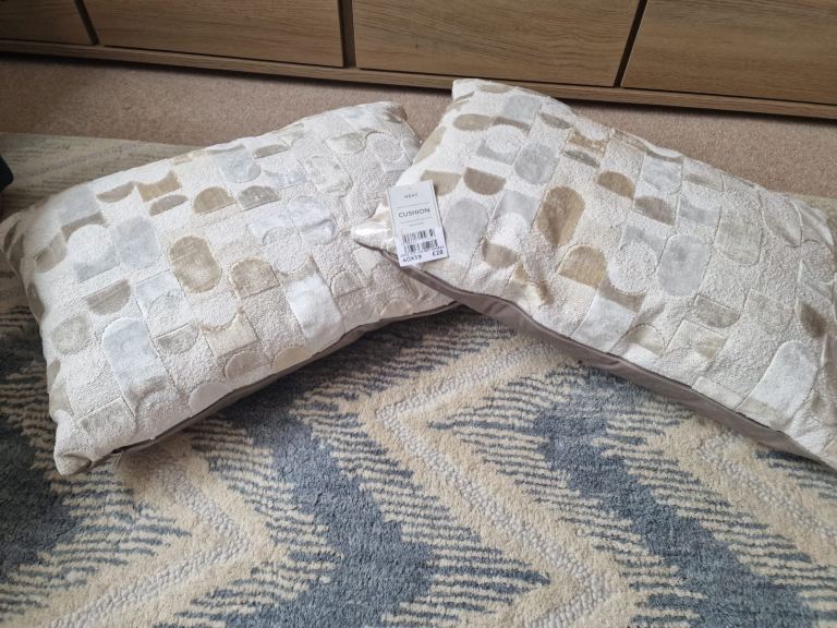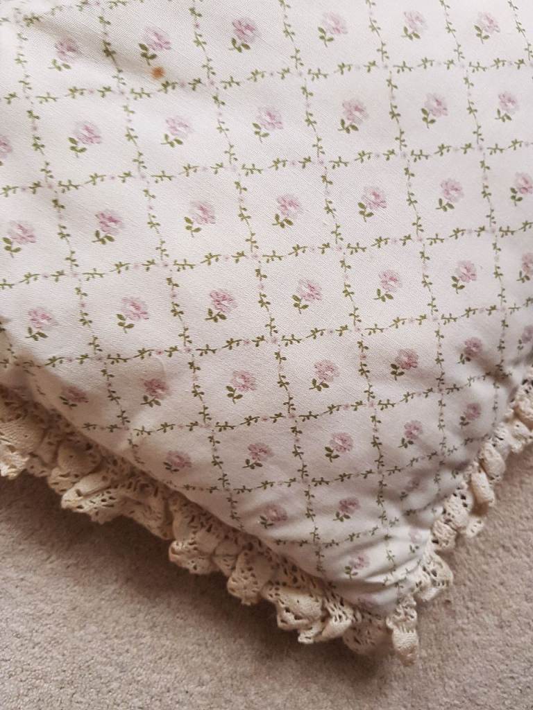 Listing various cushions mainly unused. This one was displayed for a short time in a bedroom but remains in very good condition - a couple of very tiny marks that may sponge out but not particularly noticeable. Cream with pale pink and green floral print, crotchet edges. Size approx 10.25"