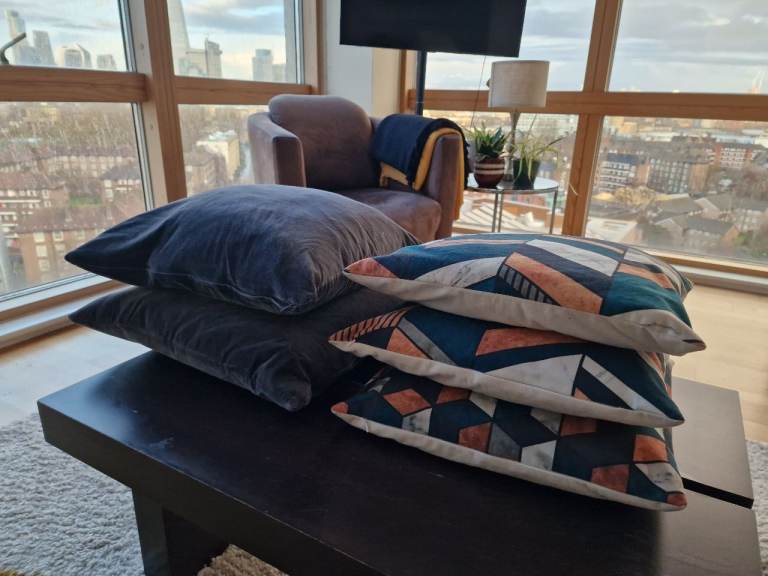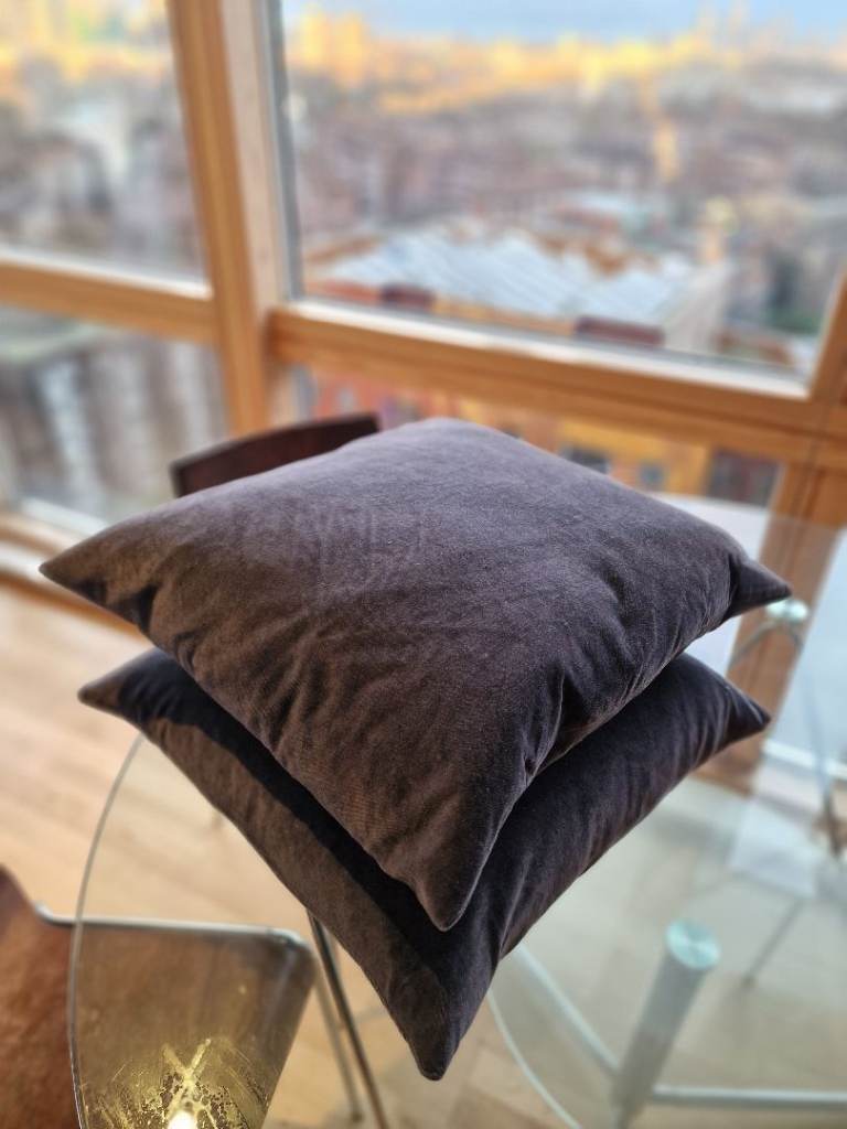 High quality large size extra puffy cushions with a soft and velvety feel, minimally used and in excellent condition.