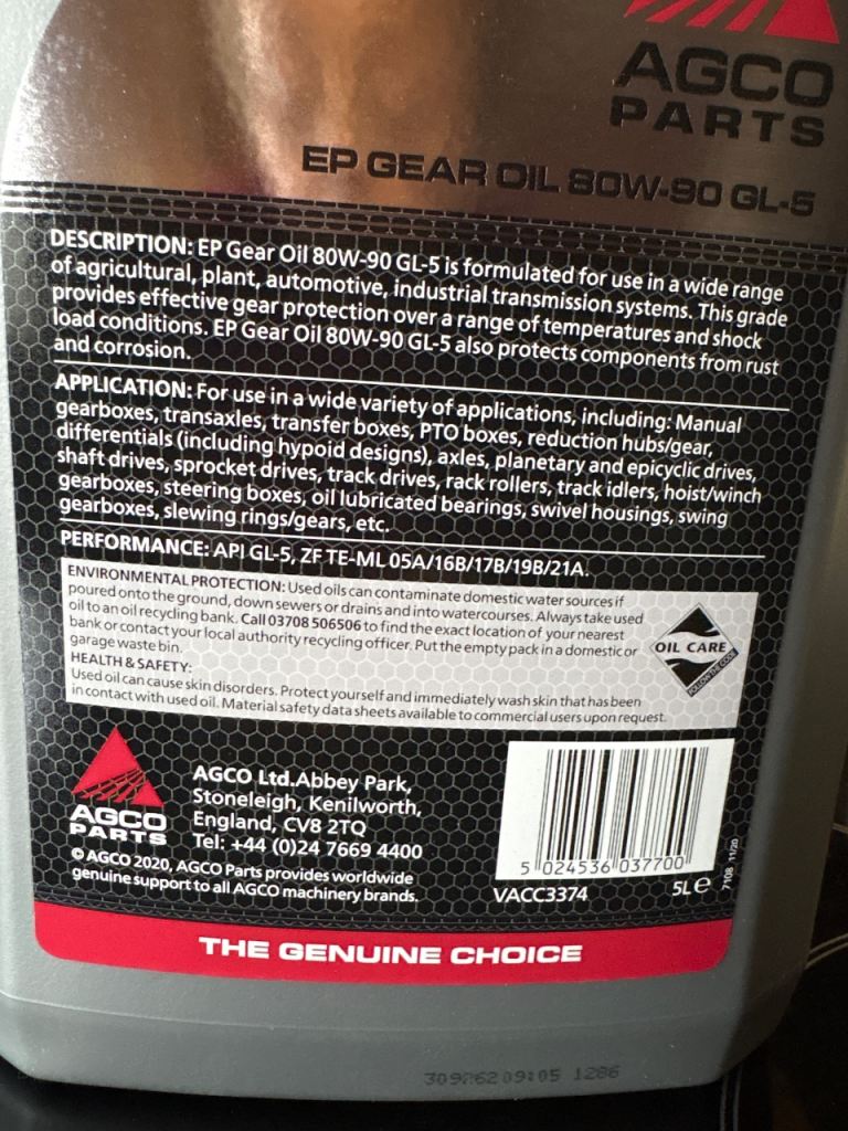 Posting for 13+ yearsAGCO Parts EP gear oil 80W-90 GL-5 new & sealed