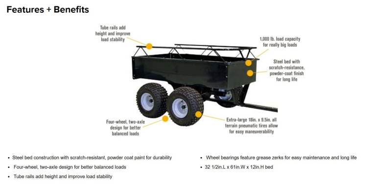 The Agri-Fab Tandem Axle ATV Trailer is extra long and has larger tires for bigger loads. Tracks perfectly behind ATVs. Convenient one-lever dump release. This cart is easier to back up than a two-wheel cart. Whether the job is getting rid of yard refuse, hauling firewood, moving sand or dumping gravel, Agri-Fab carts will complete tasks safely, reliably and efficiently for years to come.