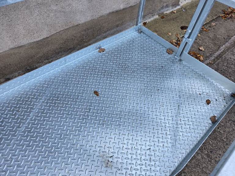 Made well, box steel, safety chain fitted, checker plate floor with kick plate.