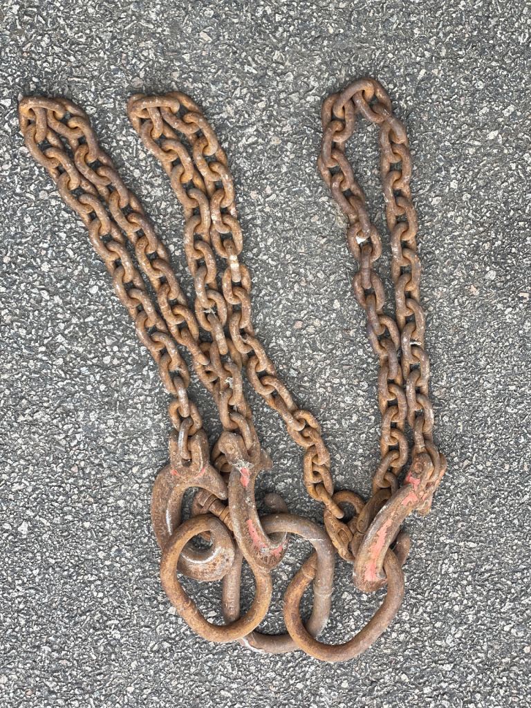 Set of 3 brothers lifting chains no certificate but links are not stretched so should pass test. 5’ long, links are 1.5”x 2” 1and an 8th” gab opening.