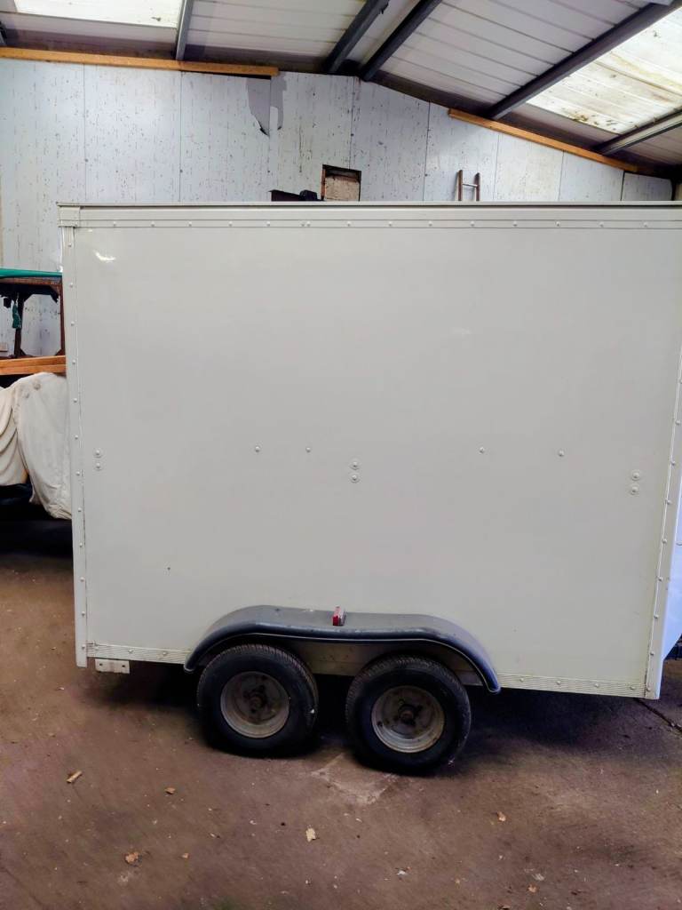 Posting for 2+ yearsA white, clean twinaxle box trailer