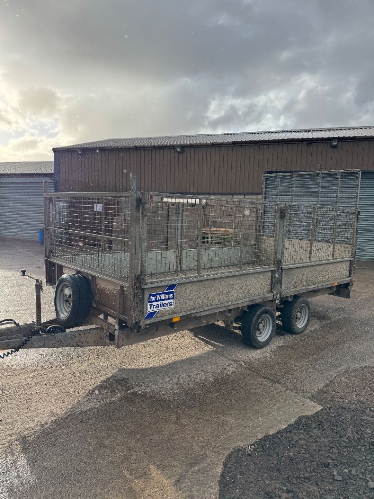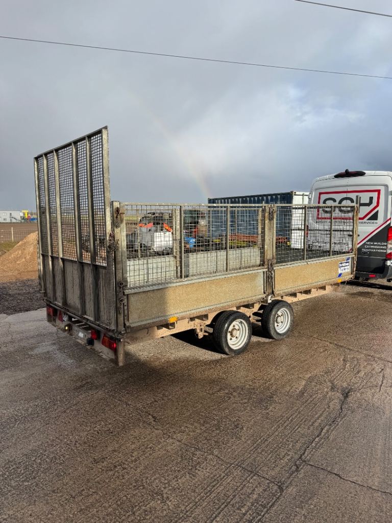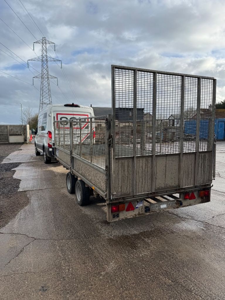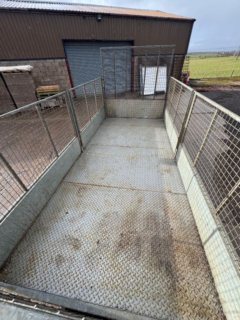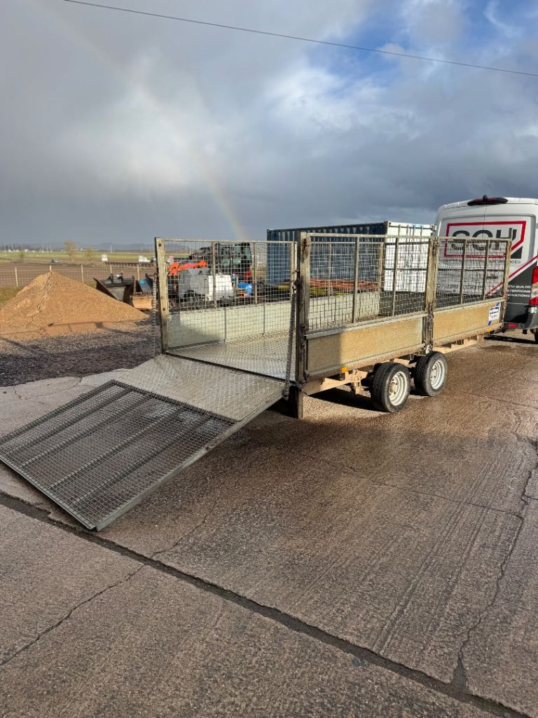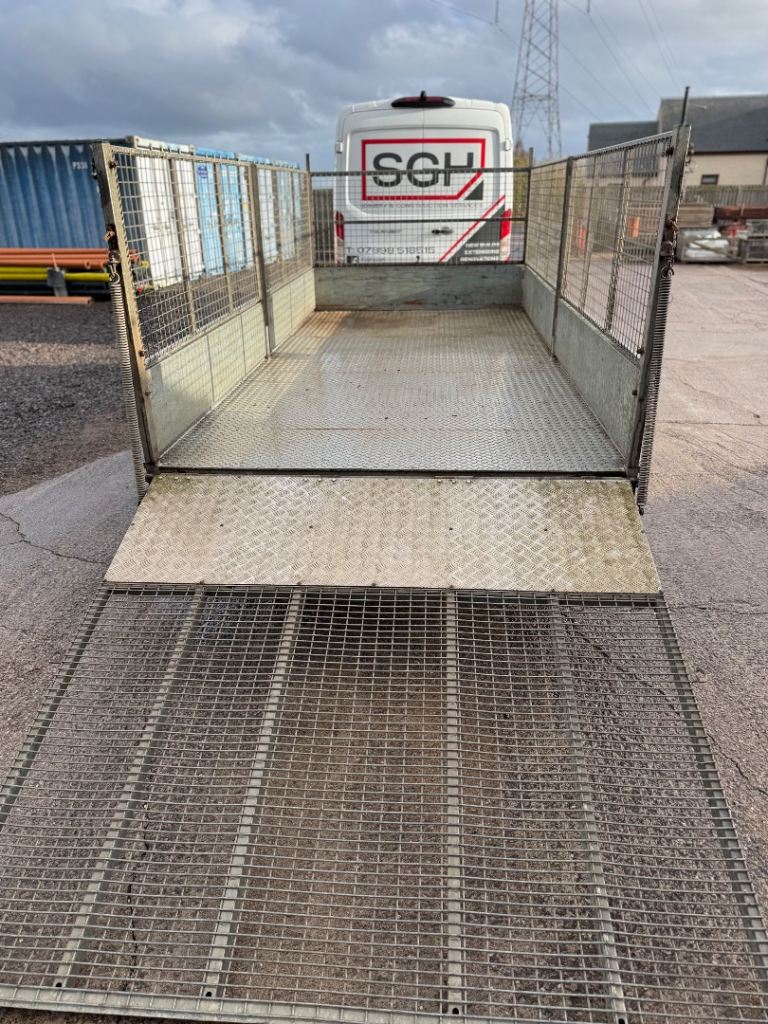 14ft trailer, Drop down sides + cage extension sides and rear ramp door, good tyres and brakes all round, solid chequer plate floor, Very good condition,