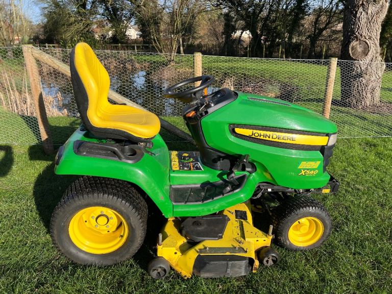 John Deere X540 Lawn Mower, V-Twin Liquid-Cooled Kawasaki I-Torque Power System Providing 16.4KW of Net Power at 3350 RPM, Twin Touch Automatic Transmission, Electric PTO CLUCH, Traction Assist Power Steering, Hydraulic Lift For Mower Deck. fitted with a 54” Deck & Mulch Kit can be removed and replaced with side discharge if required it come in good condition and good working order, please see pictures any questions please ask