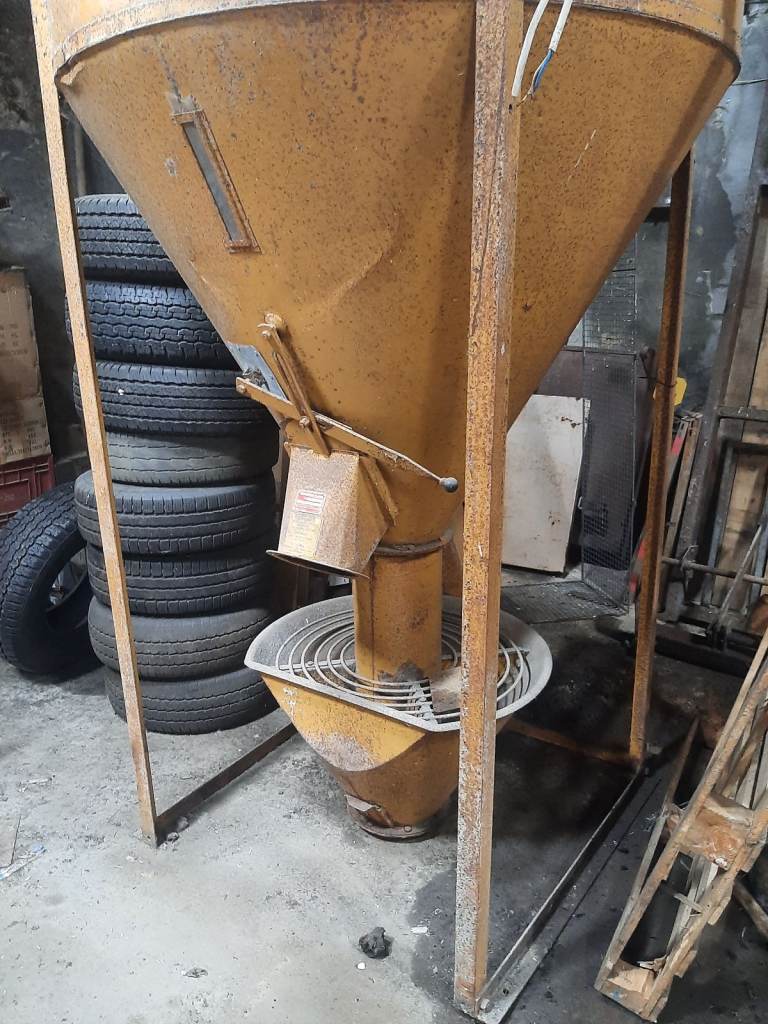 Kongskilde feed mixer, single auger in middle, bagging chute, hopper for concentrates/ minerals, flanges on top for blowing in. Motor has been removed.