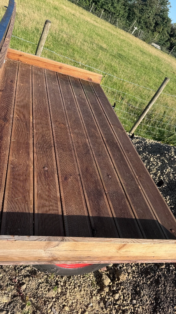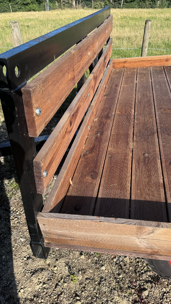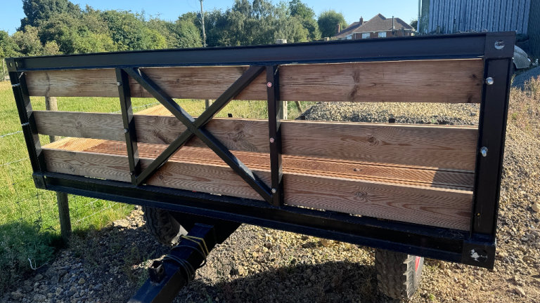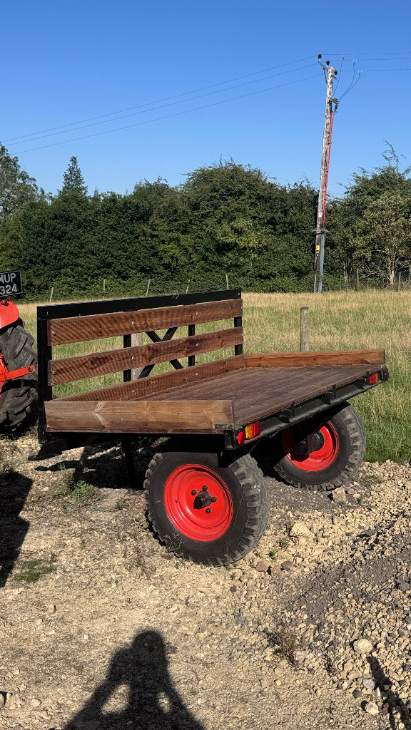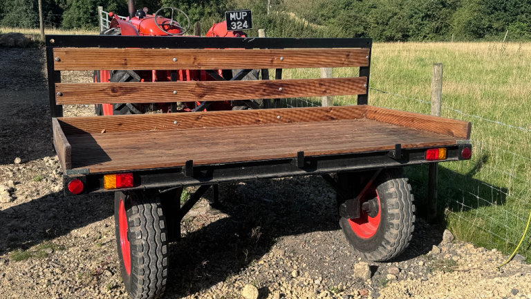 Strong timber bed with solid steel frame, good tyres, and tidy throughout. Would suit general hauling, logs, machinery, or carrying a large round (Heston-type) bale.