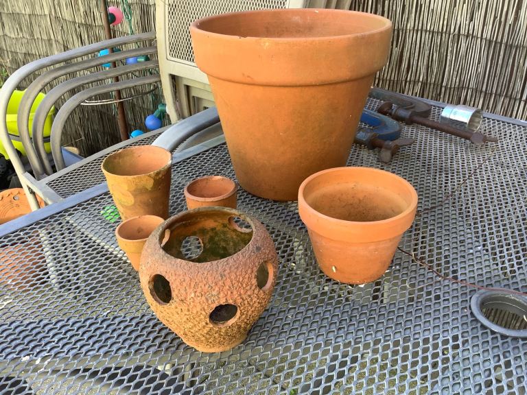 6 x terracotta plant pots various shapes & sizes collect from wigston