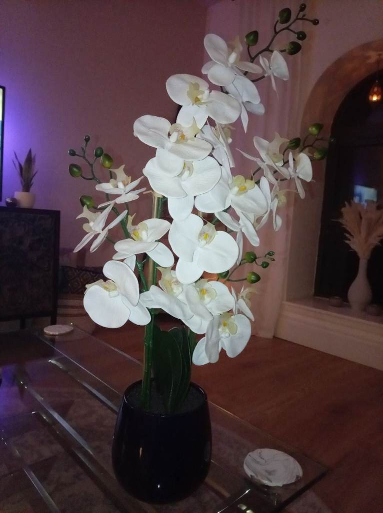 Beautiful faux tall white orchid in black pot