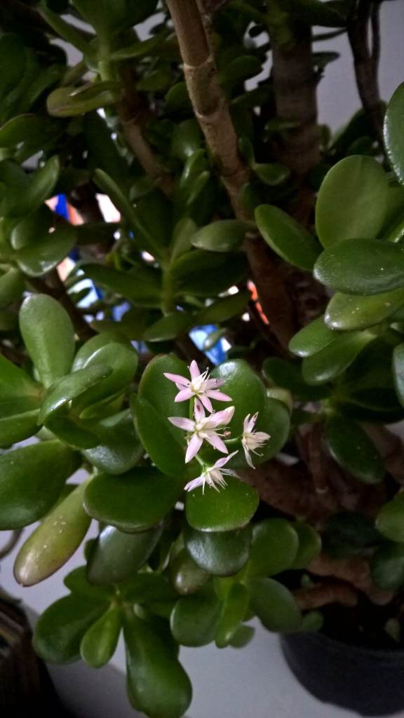 ''Crassula ovata, commonly known as jade plant, lucky plant, money plant or money tree, is a succulent plant with small pink or white flowers that is native to the KwaZulu-Natal province and Eastern Cape of South Africa and Mozambique, and is common as a houseplant.''