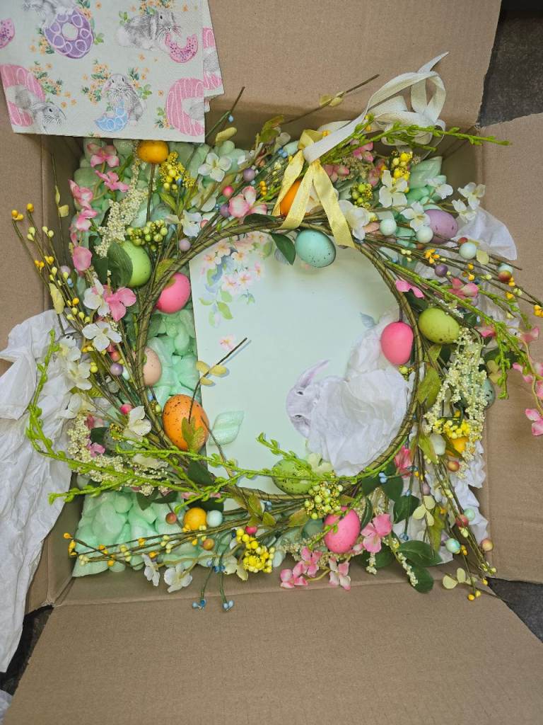 Lovely new Easter wreath, perfect for your front door or wall. It's decorated with pretty pastel eggs, flowers, and greenery, still in its original packaging.