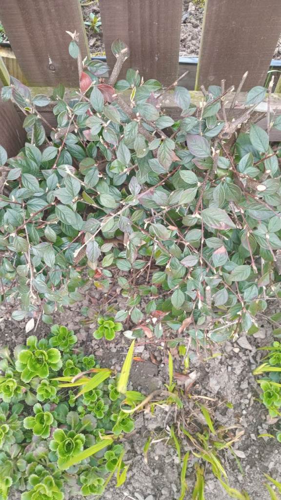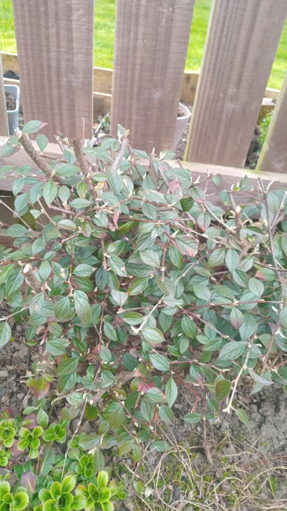 Established cotoneaster shrub, currently growing well along fence.