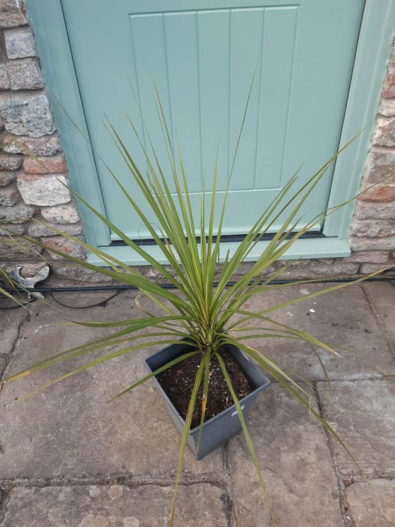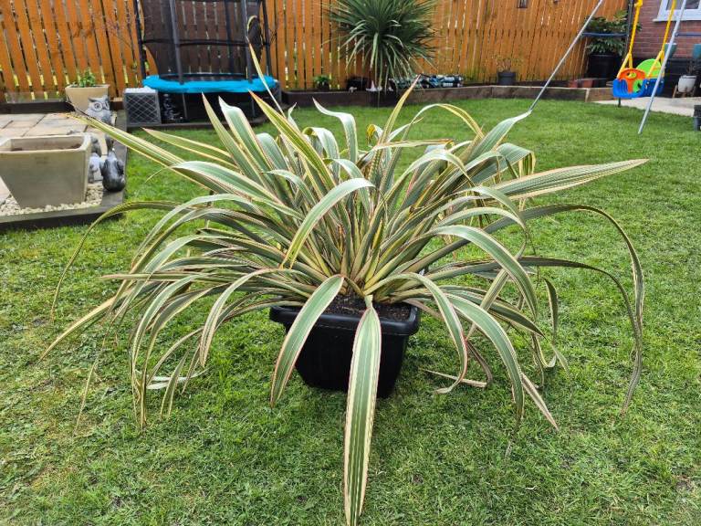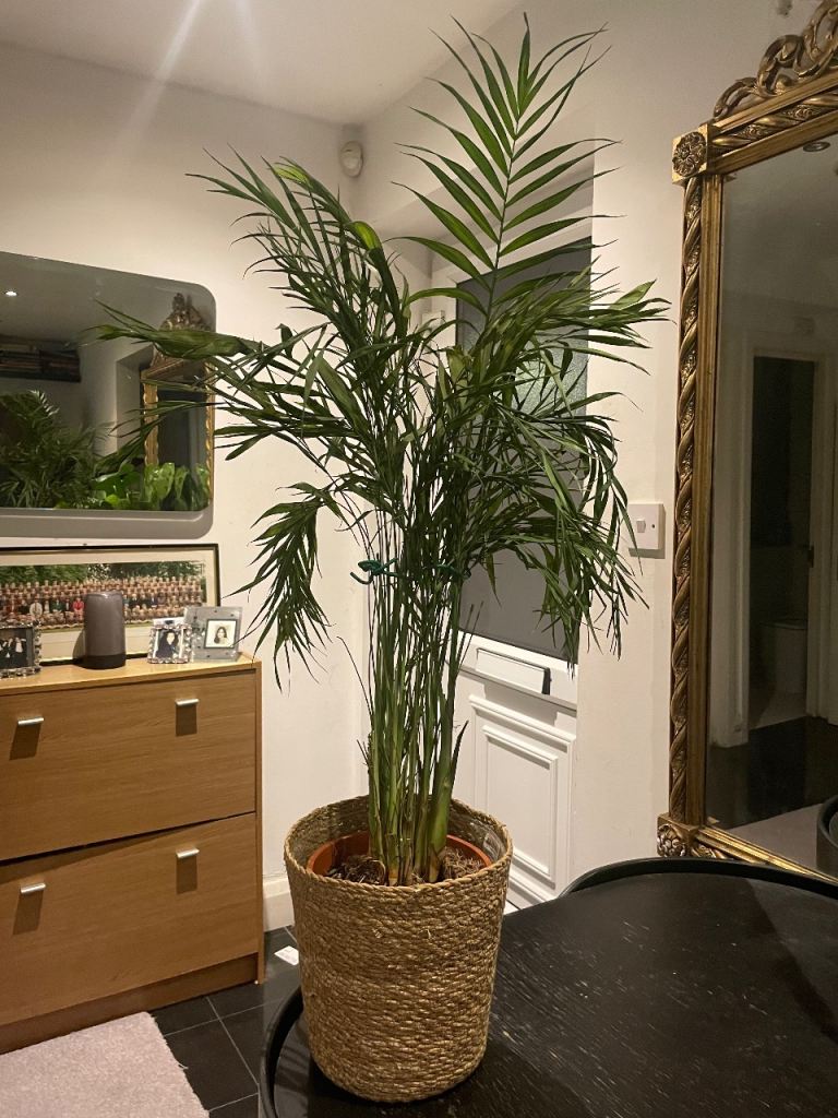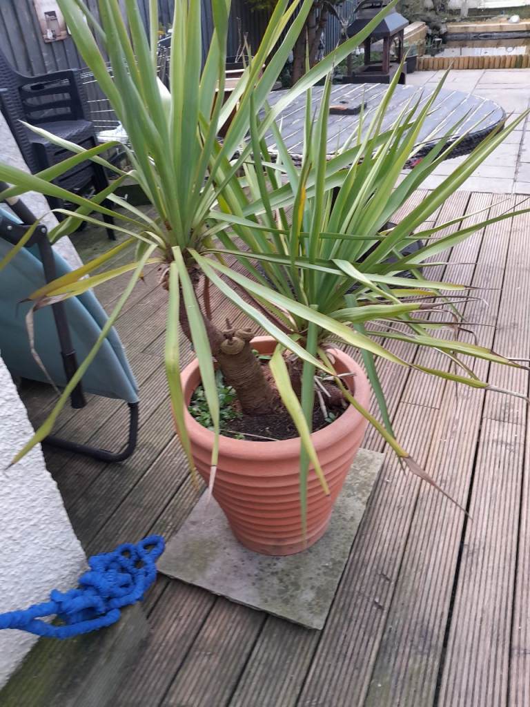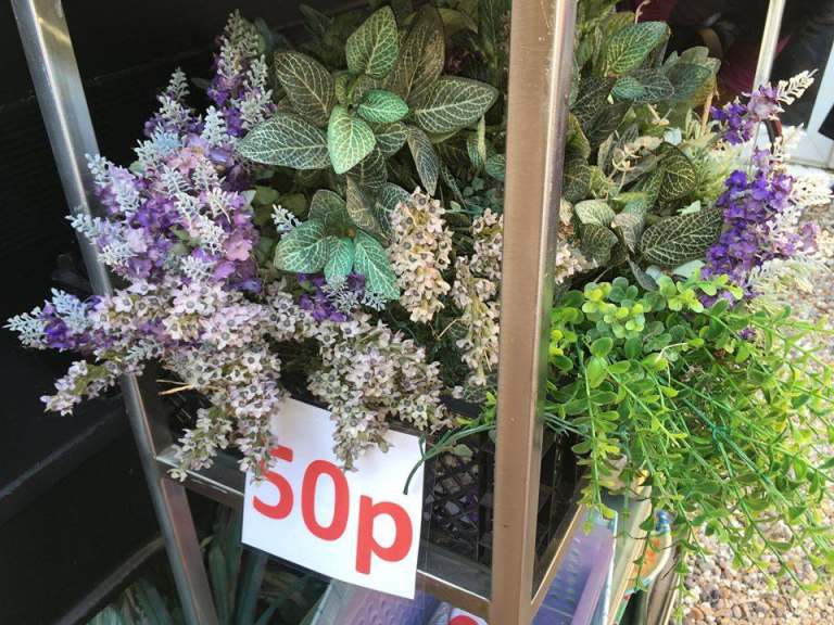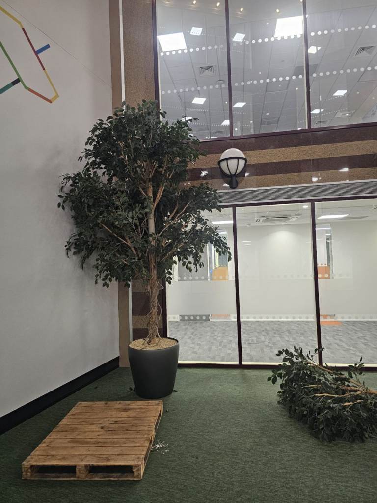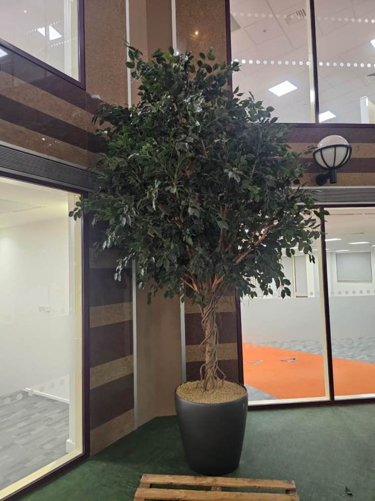 This is an artificial ficus tree with a real wood trunk and a grey pot.