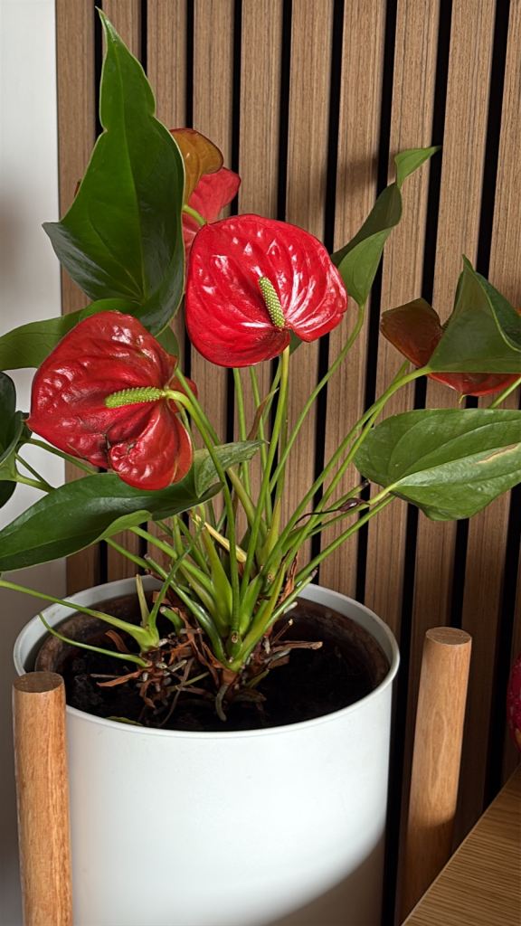 Indoor plant. Anthurium Dimond red flamingo. In clay pot.