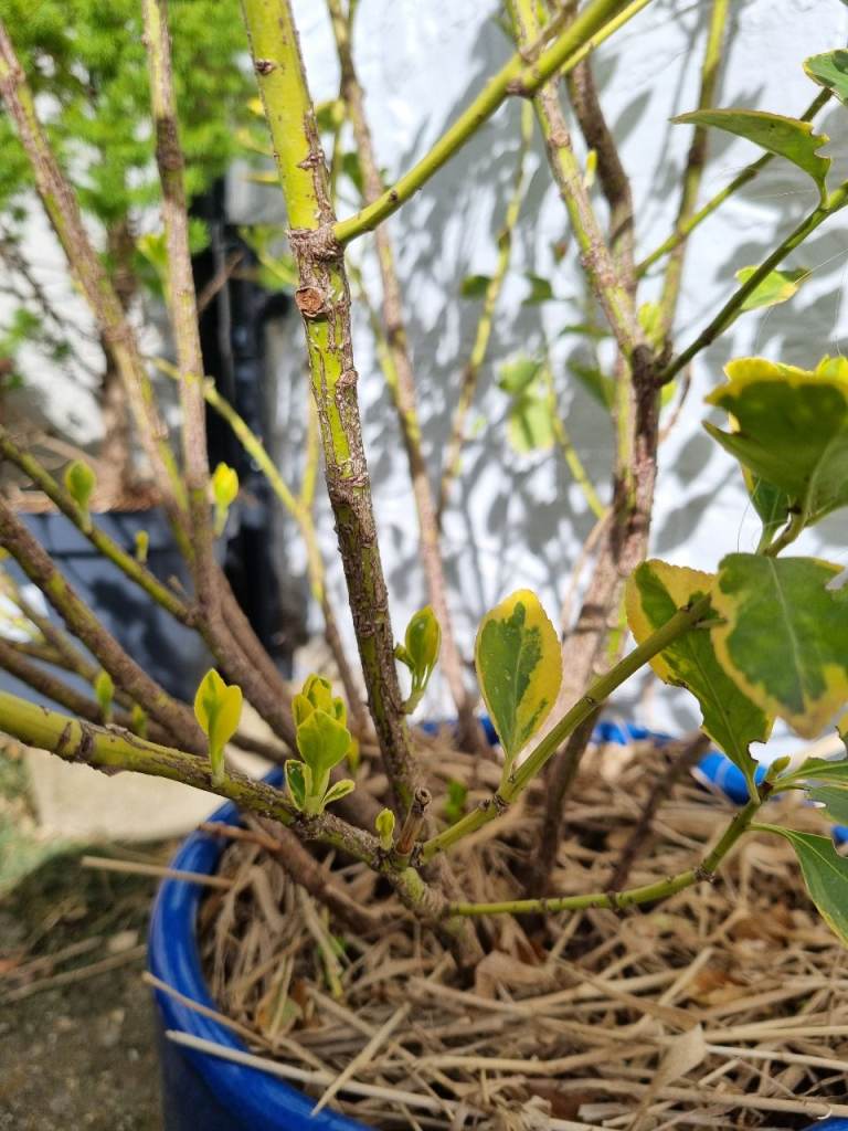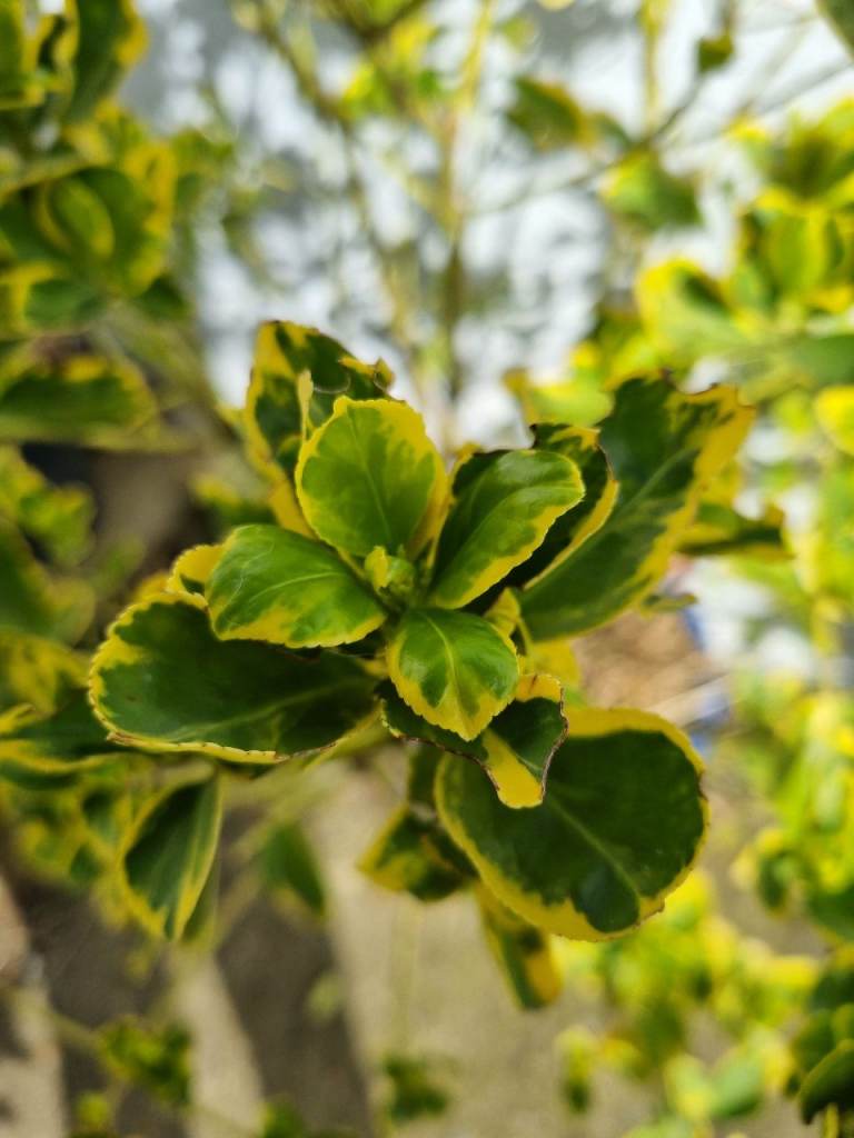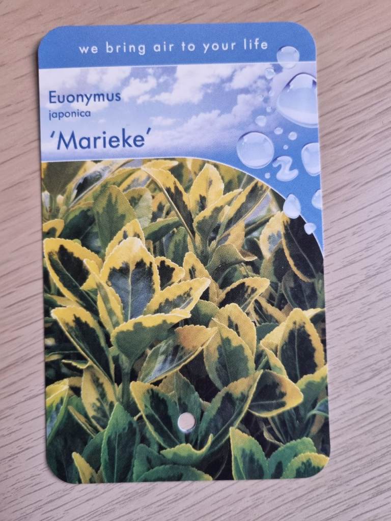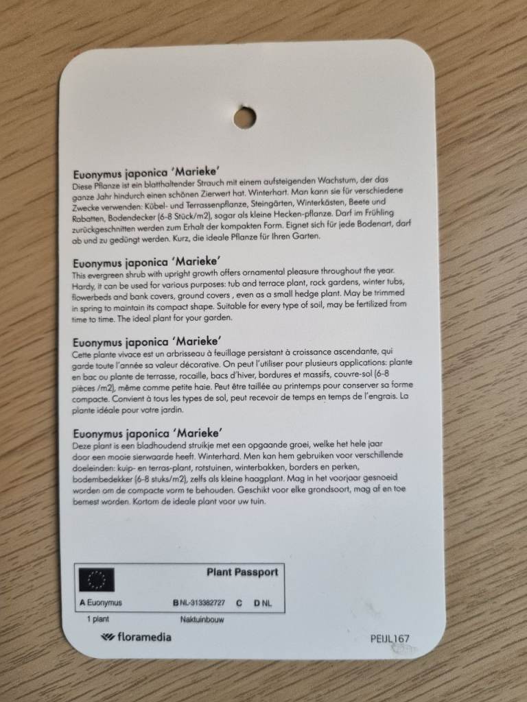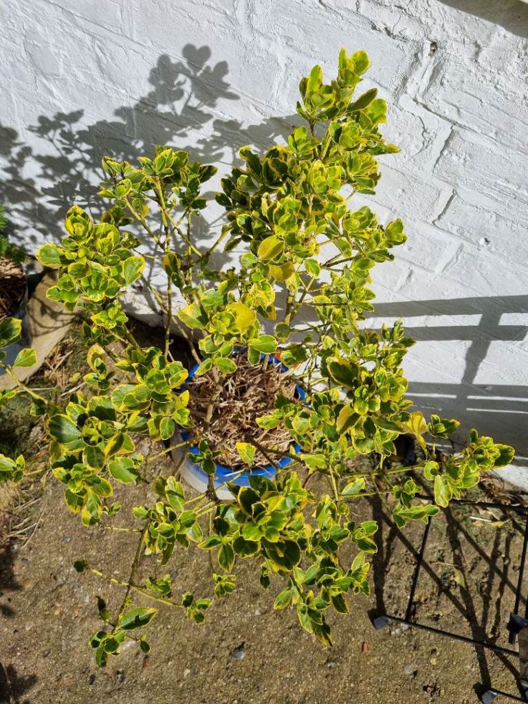Outdoor plant in beautiful large blue and white ceramic pot. Eonymus japonica of the marieke variety. Bought it about 5 years ago. It unfortunately was infected with scale (white and beige spots) early on but the plant still grows new leaves every year. The ceramic pot is included.