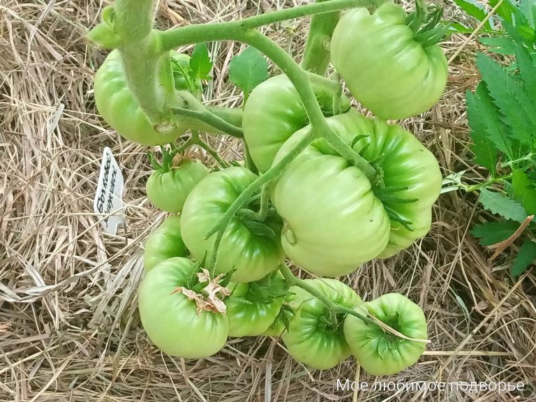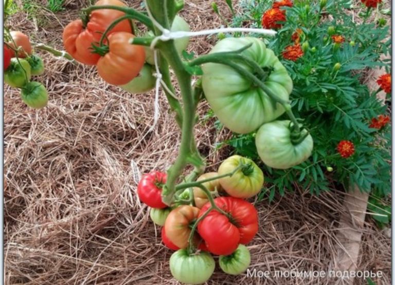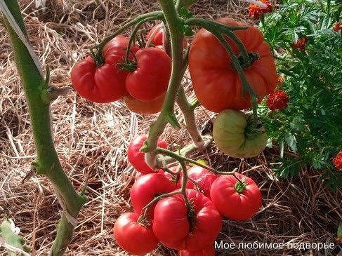 •red fruits vary in shape, from barrel-shaped to flattened round, heart shape, with slightly ribbed edges, weighing 300 to 500 grams. When grown on a single stem, they can reach a weight of up to 800 grams.