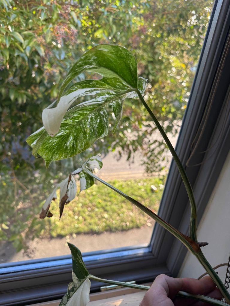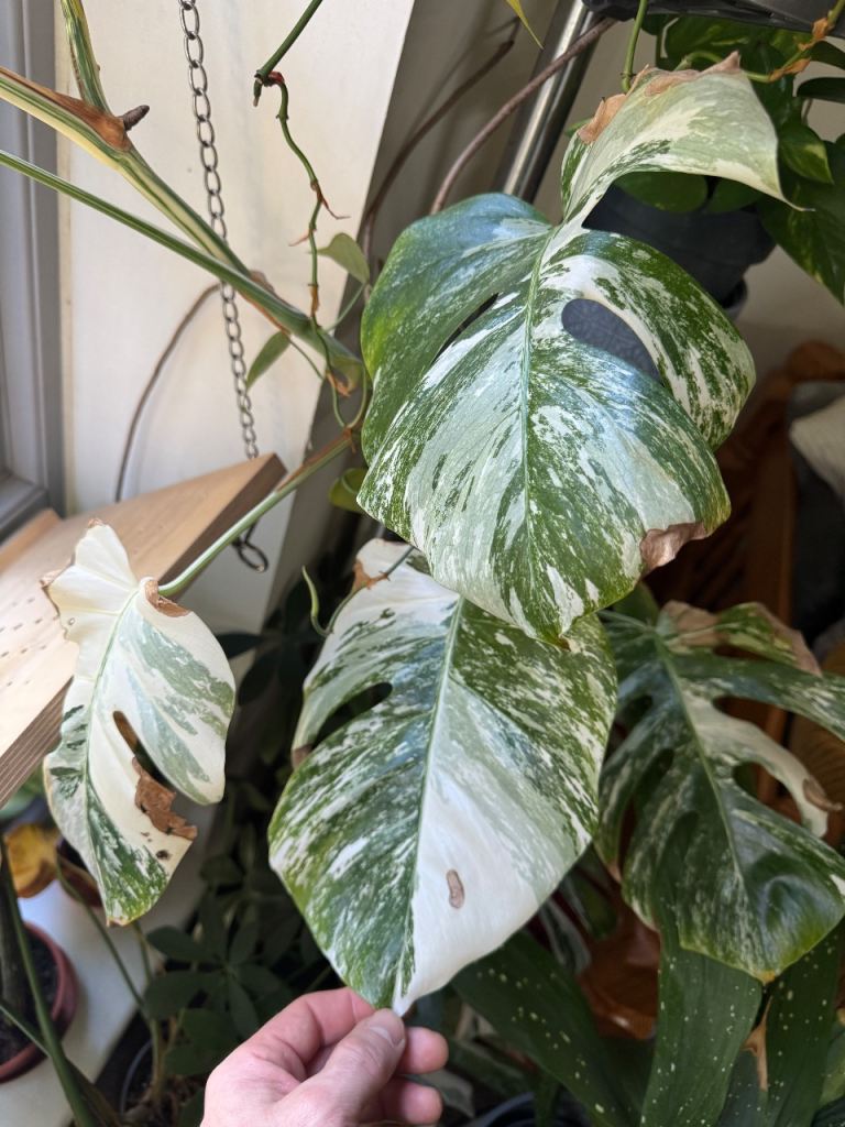 Leaves have some mechanical damage from cats and transportation over time. But the plant is healthy overall.